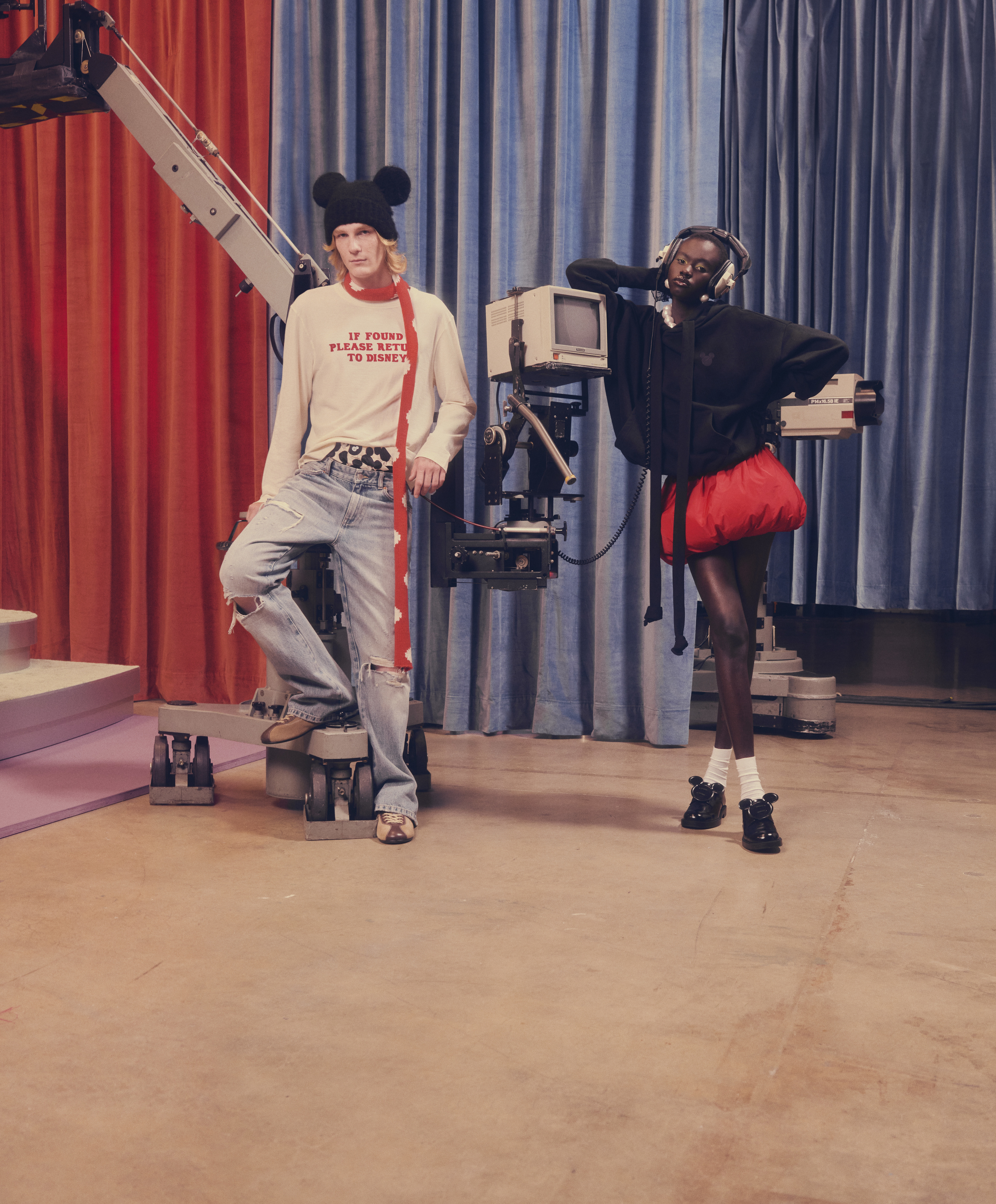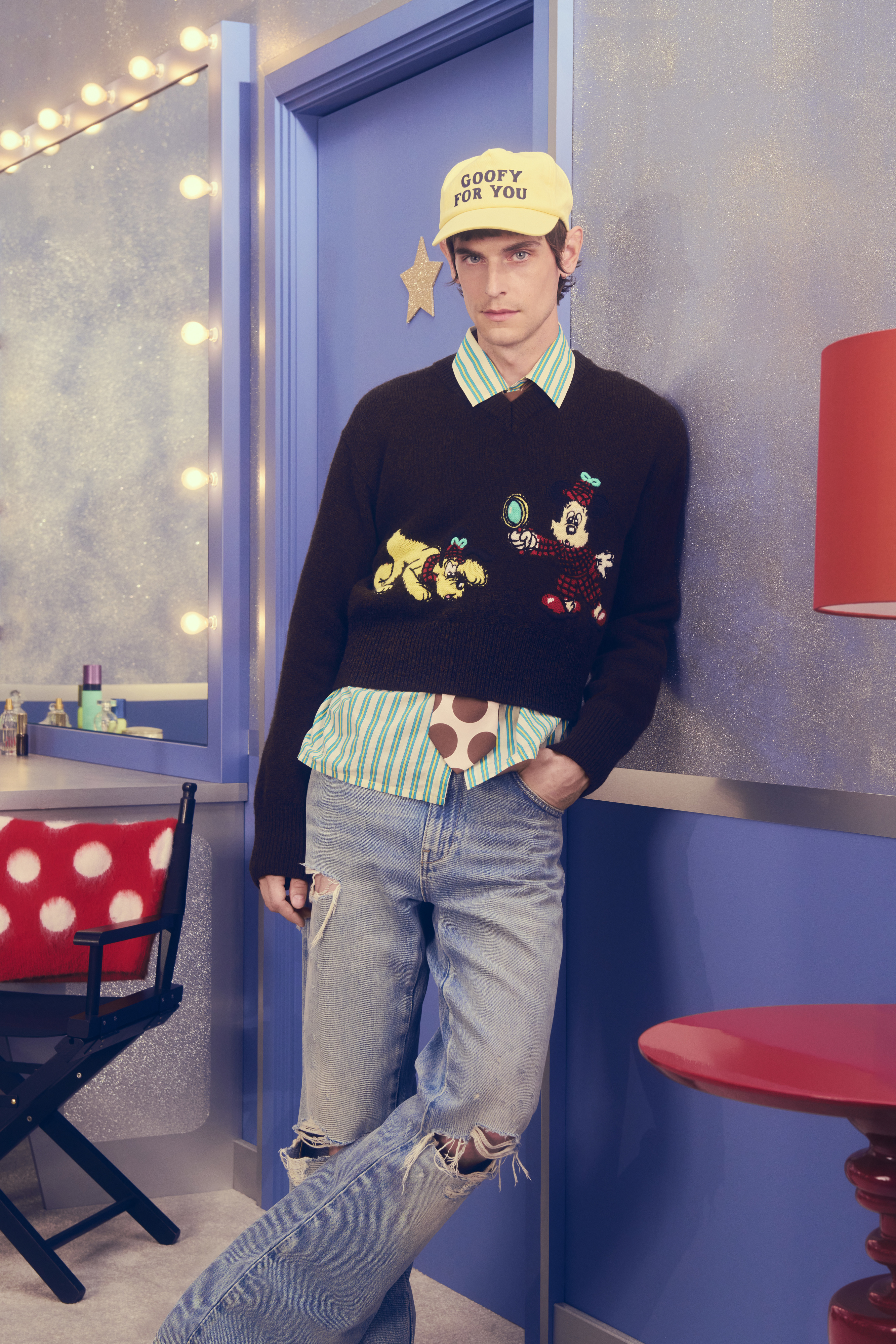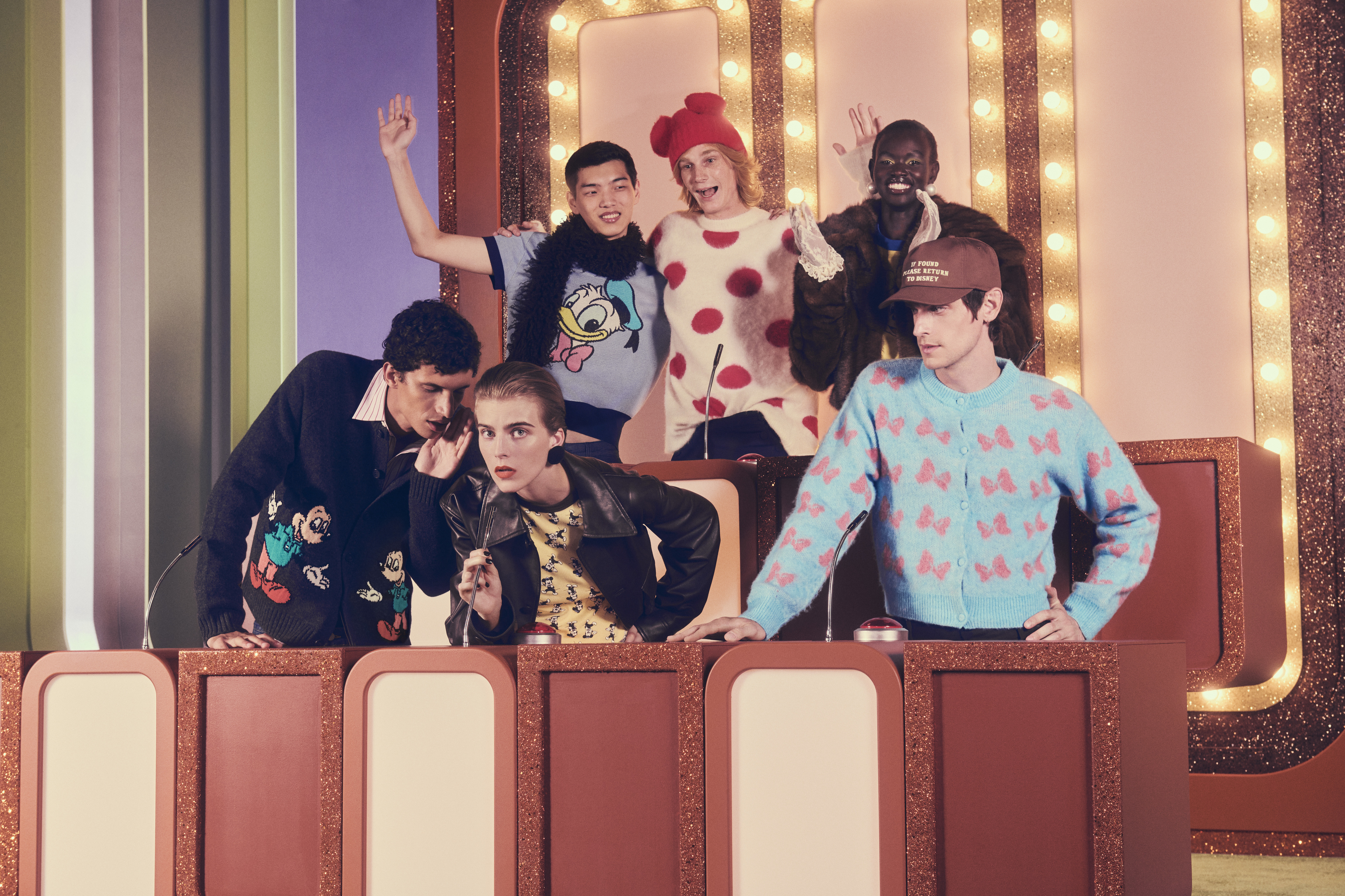 A linha feminina conta com saias volumosas em pelo sintético, cardigans com laços, fatos curtos em faux-fur, vestidos acetinados com bolinhas divertidas e denim maxi que pede T-shirts largas. Tudo num jogo de cores que vai das mais vibrantes às pastel, passando pelo preto profundo que funciona como contorno gráfico de desenho animado. Já na linha masculina, a vibe é mais desportiva e tem casacos activewear em denim vintage rosa ou vermelho, fatos de treino retro em azul e castanho, malhas estampadas com personagens e um tailorings descontraídos.