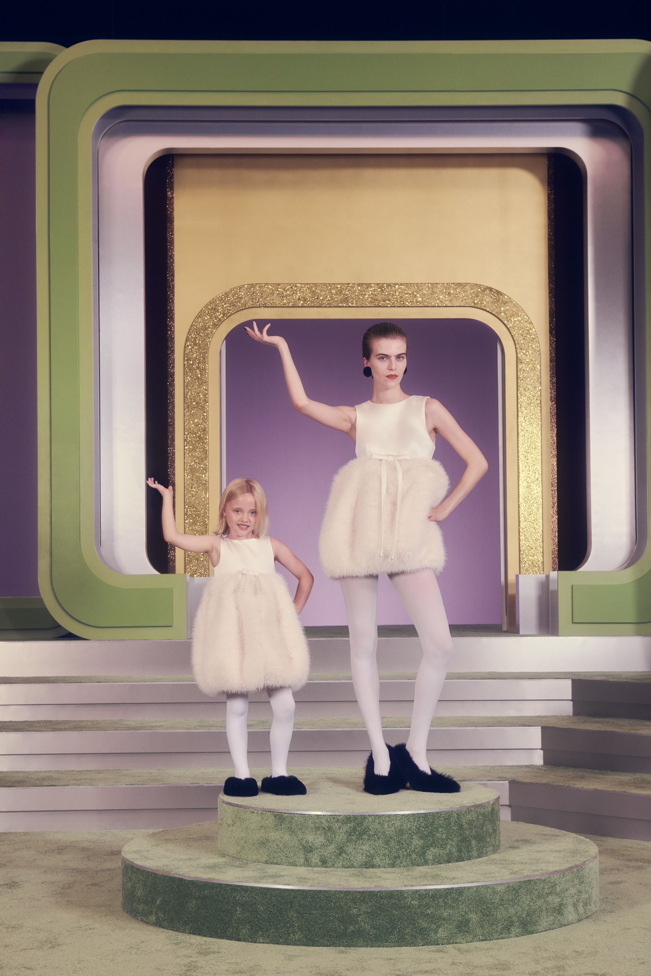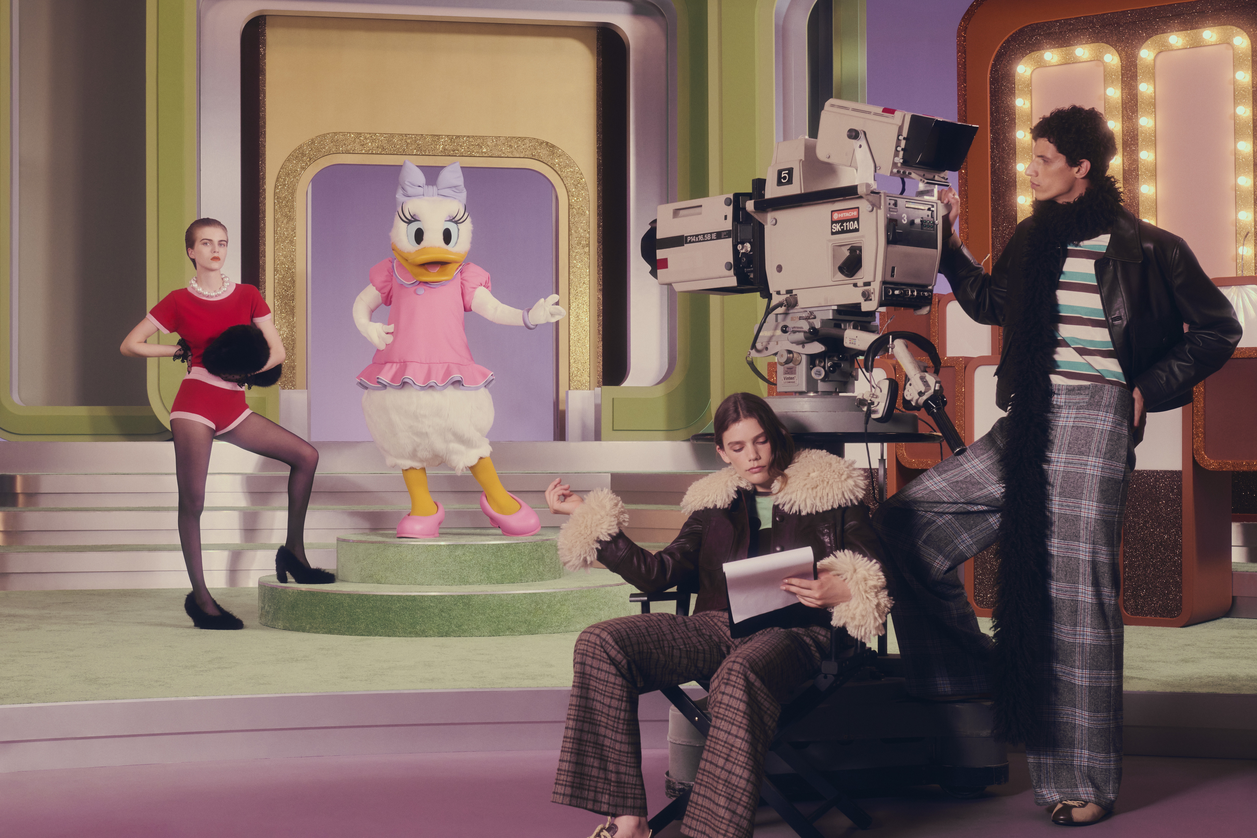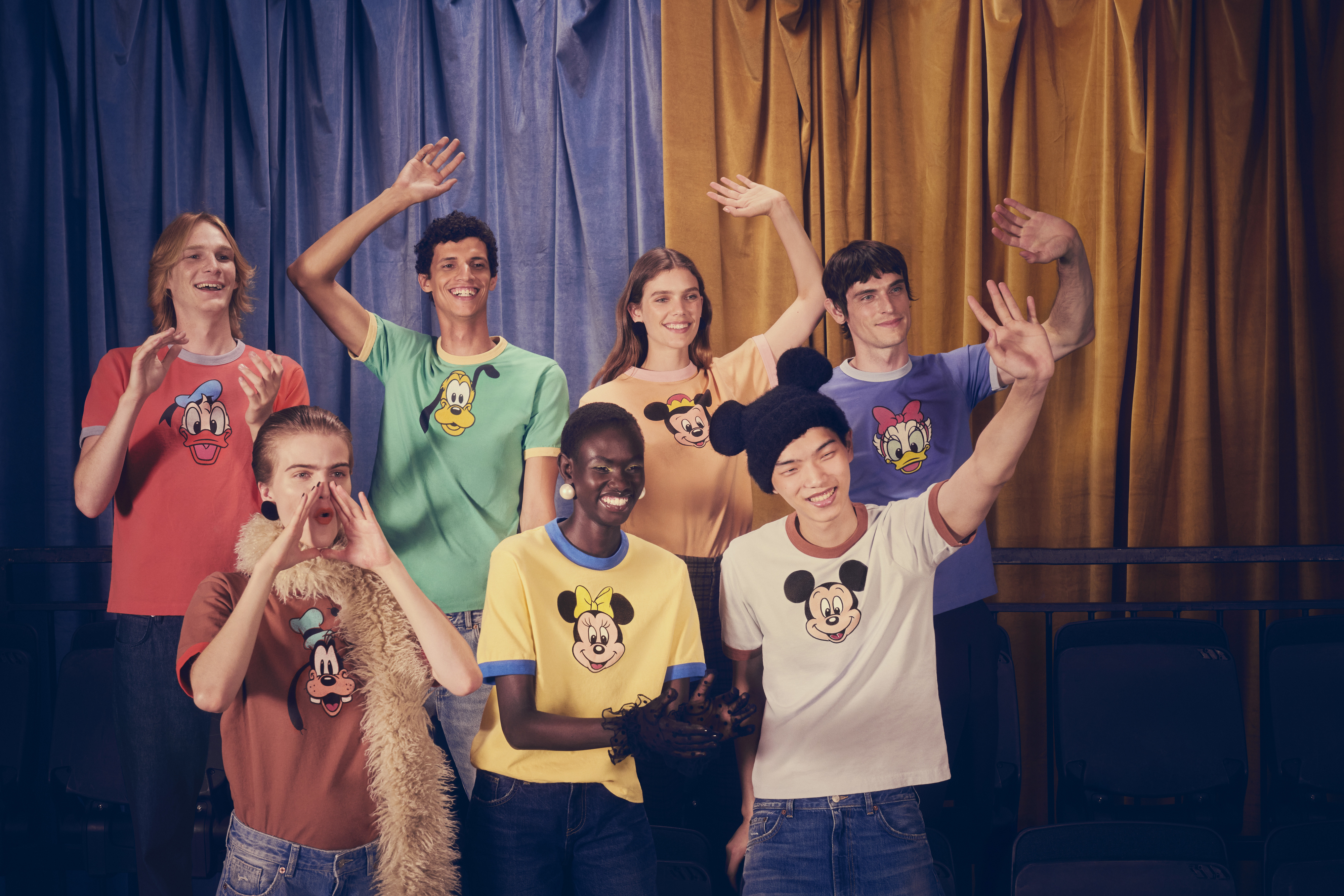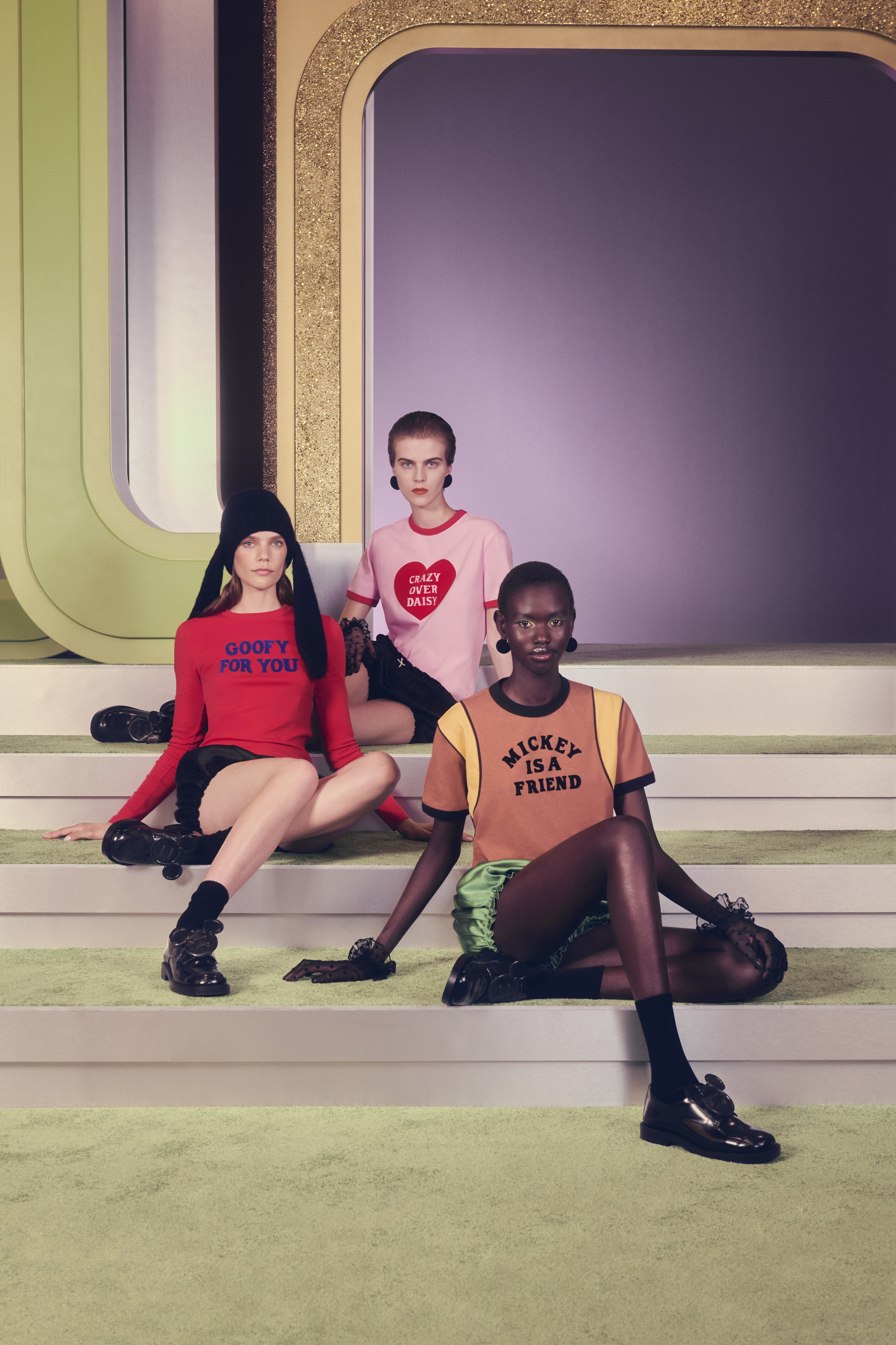 A linha feminina conta com saias volumosas em pelo sintético, cardigans com laços, fatos curtos em faux-fur, vestidos acetinados com bolinhas divertidas e denim maxi que pede T-shirts largas. Tudo num jogo de cores que vai das mais vibrantes às pastel, passando pelo preto profundo que funciona como contorno gráfico de desenho animado. Já na linha masculina, a vibe é mais desportiva e tem casacos activewear em denim vintage rosa ou vermelho, fatos de treino retro em azul e castanho, malhas estampadas com personagens e um tailorings descontraídos.