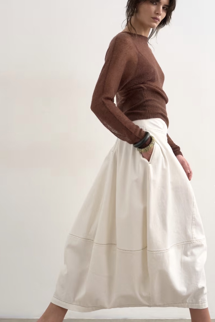 Por isso, não é de espantar que as saias estejam a regressar em força esta primavera, afirmando-se como uma das peças mais relevantes da estação. Depois de temporadas dominadas por calças largas, muita ganga e silhuetas mais rígidas, esta é a altura do ano em que a fluidez, o movimento e a leveza começam a dar o ar da sua graça. E poucas peças traduzem isso tão bem quanto uma saia.