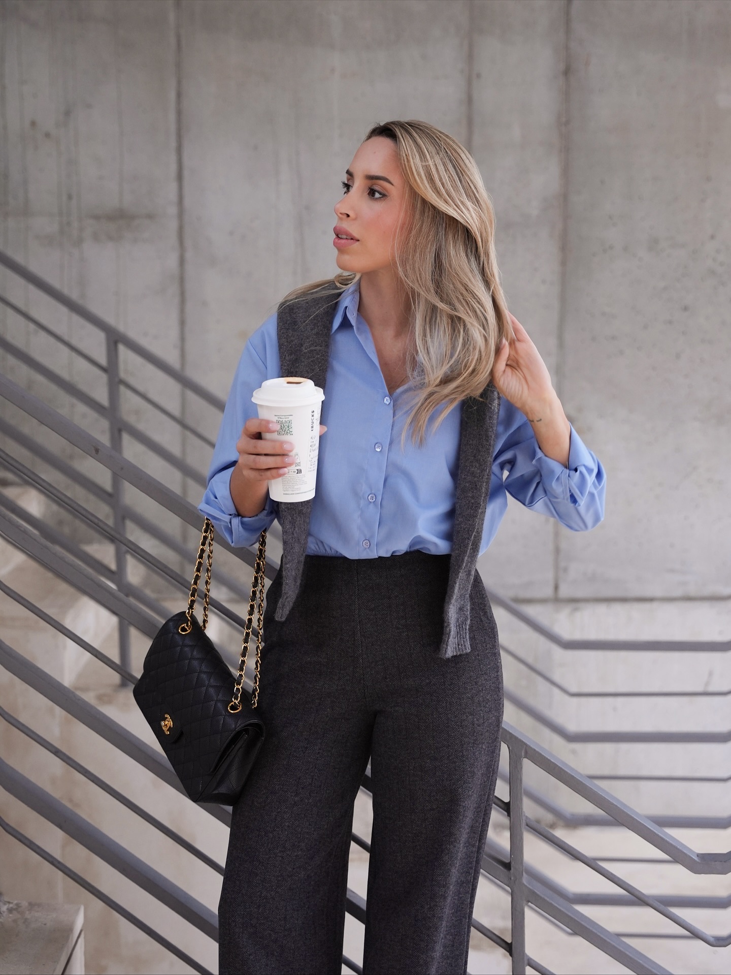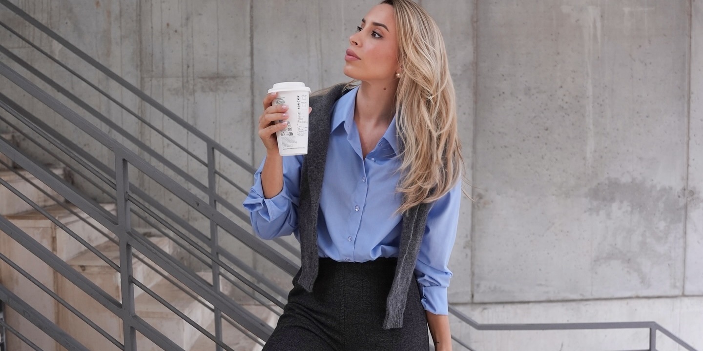 Na última publicação do Instagram, apareceu com umas calças cinzentas e uma camisa azul, que completou com um pullover aos ombros. Ficámos rendidos ao look, especialmente porque são cores que se complementam na perfeição, mas não deixámos de reparar no modelo de calças que levava.