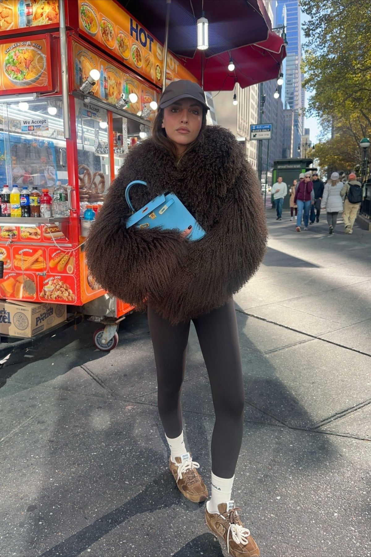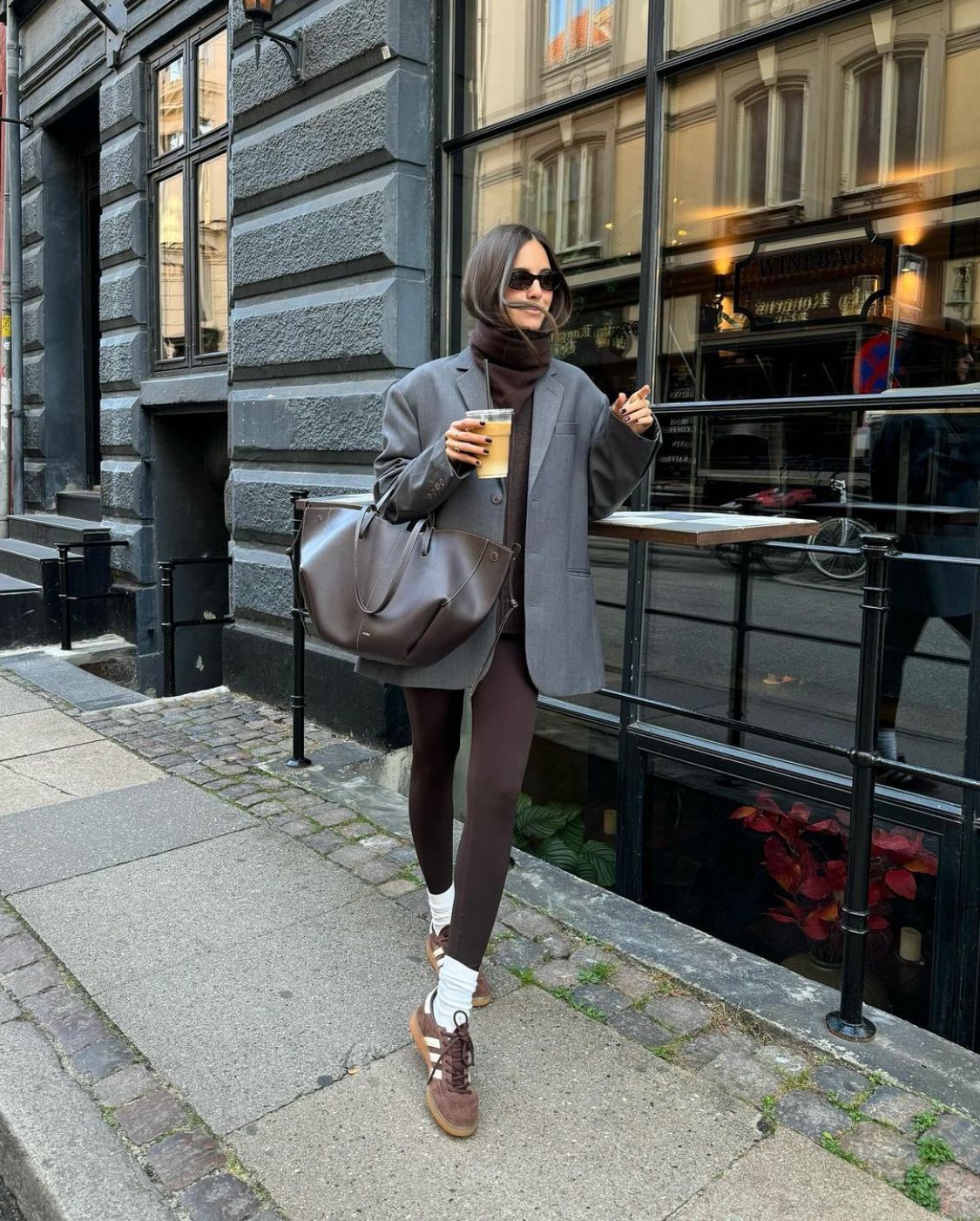 Também as cores e os detalhes ajudam a reforçar esta mudança de atitude. Tons como castanho, camel ou chocolate substituem o preto absoluto, enquanto meias à vista, malas estruturadas e óculos marcantes elevam o look e lhe dão um lado mais editorial, mesmo quando a base continua a ser uma peça associada ao conforto.