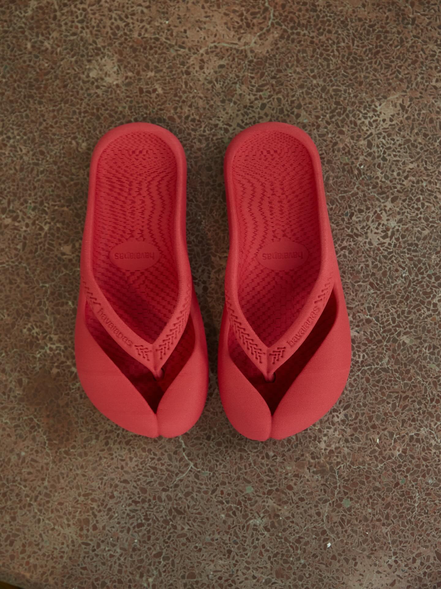 O modelo foi criado em colaboração com a startup alemã Zellerfeld, especialista em calçado feito por impressão 3D, e mantém o ADN da Havaianas, como a sola texturizada que imita grãos de arroz e a clássica tira em Y entre os dedos. Contudo, a silhueta é mais robusta, anatómica e com um toque quase escultórico, sendo que o bico frontal é arredondado, mas os dedos ficam parcialmente cobertos e a sola é espessa.