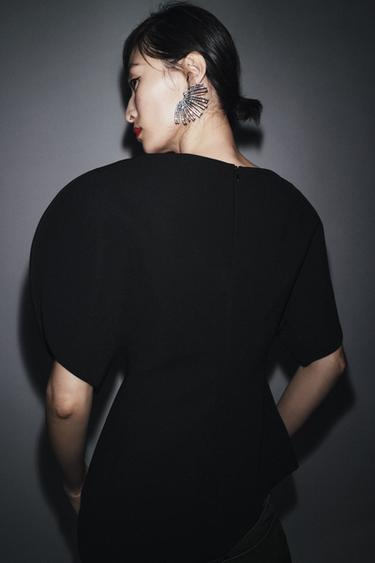 Com umas mangas curtas abalonadas, decote redondo e fecho de correr nas costas, o top conjuga um corte assimétrico com mangas vistosas, elevando imediatamente qualquer outfit. É o típico básico nada óbvio, perfeito para usar tanto numa ocasião especial como no dia a dia.