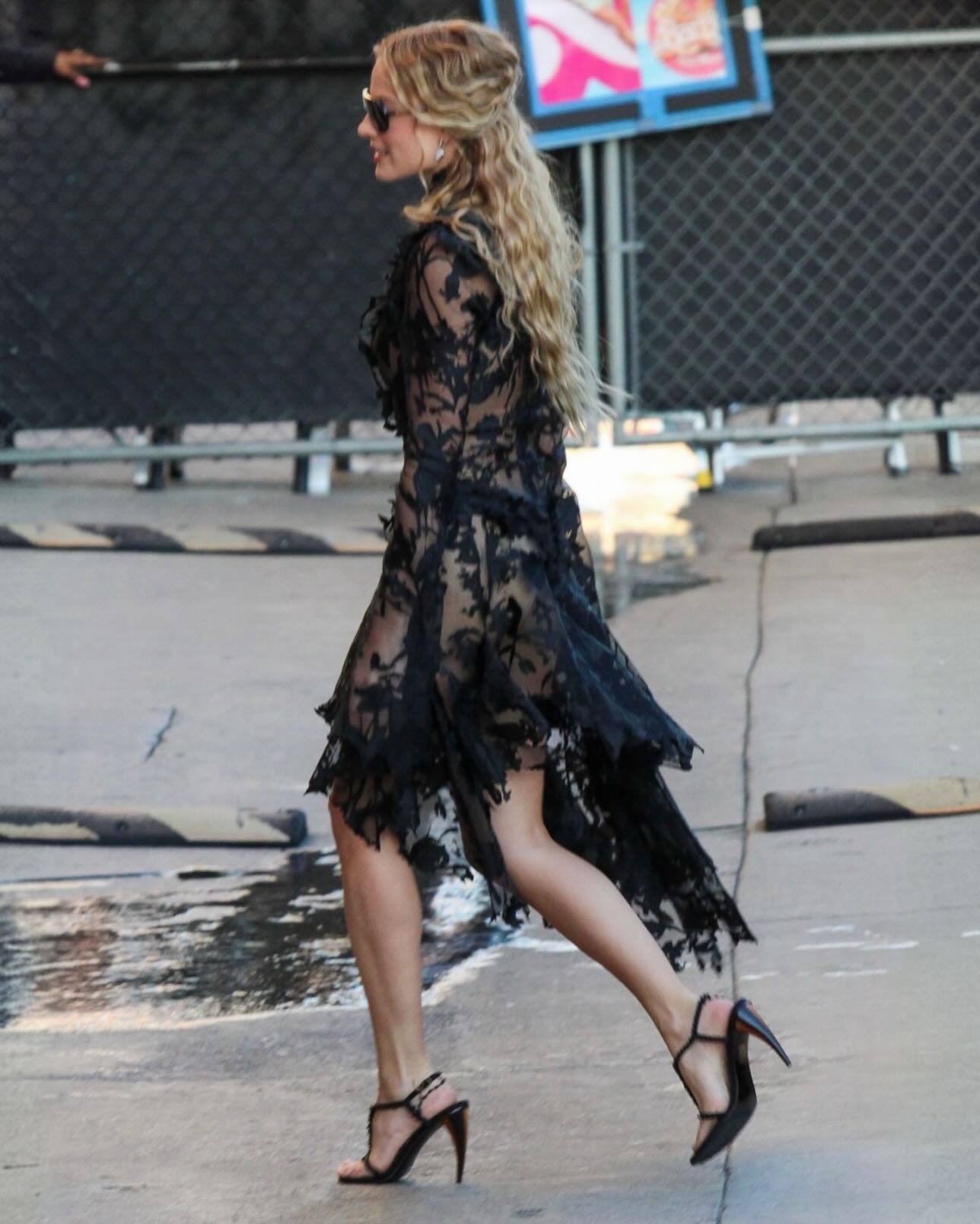 O primeiro look da press tour, usado na chegada ao "Jimmy Kimmel Live", levantou logo a ponta do véu em relação ao que aí vinha. Para a ocasião, a artista usou um vestido preto em renda da coleção primavera/verão 2026 com assinatura de Alexander McQueen, com gola subida, recortes estratégicos no corpete e mangas em sino, que evocava dramatismo do século XIX sem cair na armadilha do figurino de época.