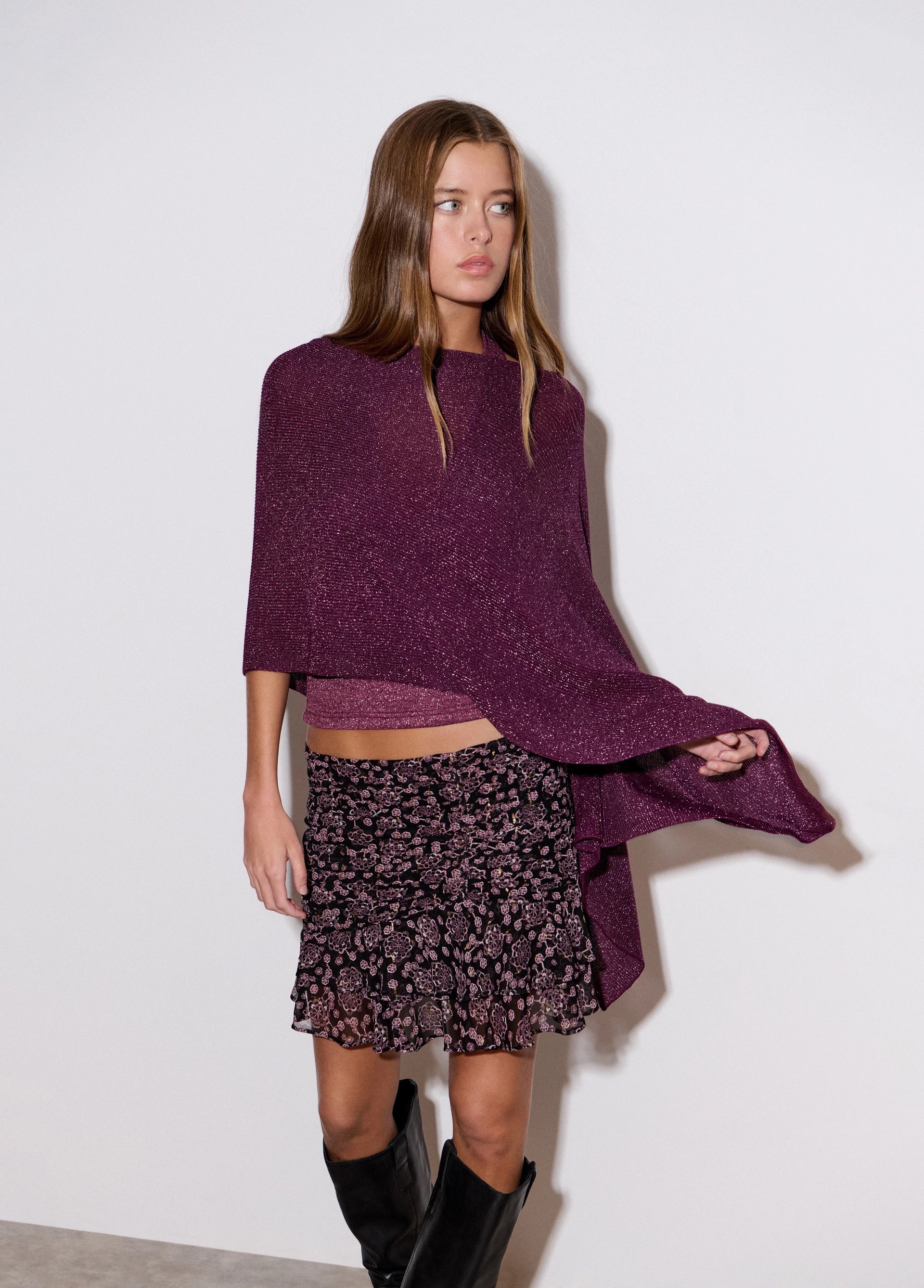 A proposta mergulha nos clássicos da noite, como lantejoulas, malhas cintilantes e transparências, mas dá-lhes uma frescura jovem, como é apanágio da marca. Há saias curtas que brilham e são tão espelhadas que parecem feitas de uma autêntica bola de espelhos, combinadas com malhas finas que se cruzam na cintura e deixam o look num registo descontraído.