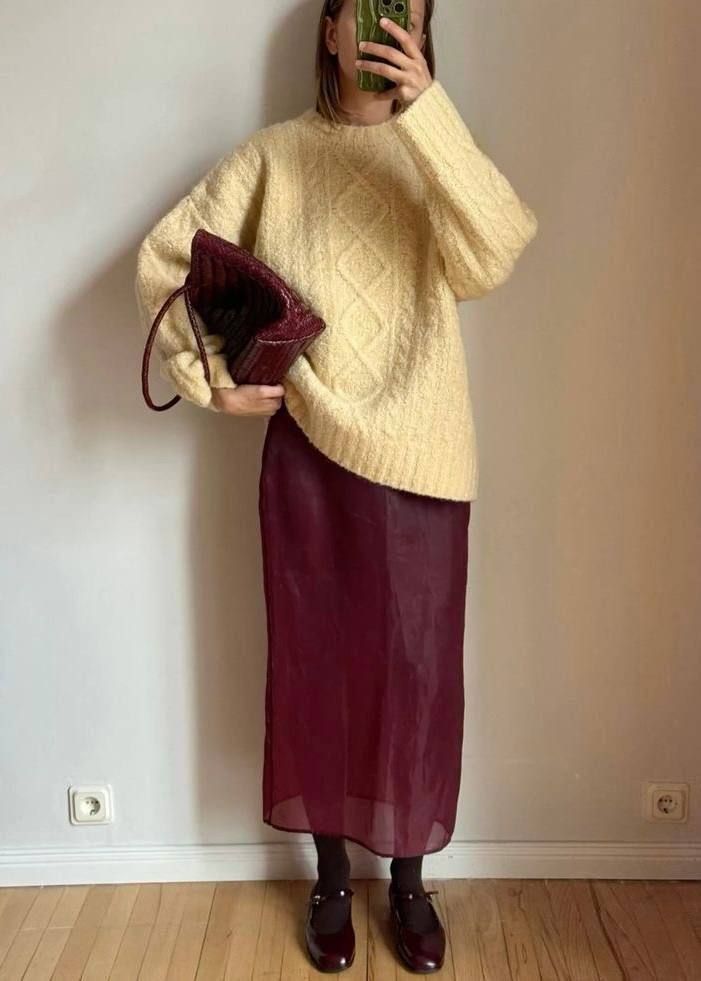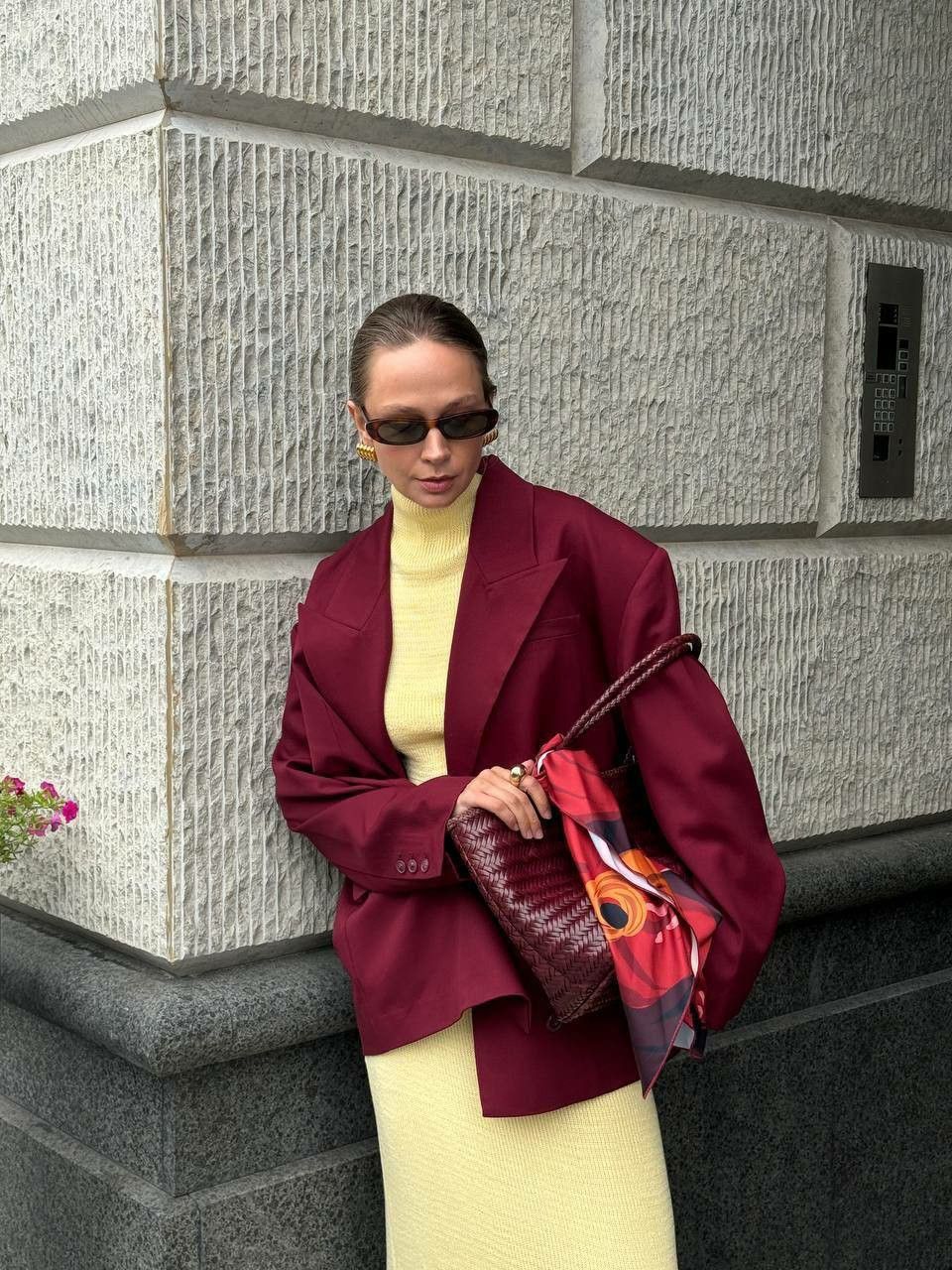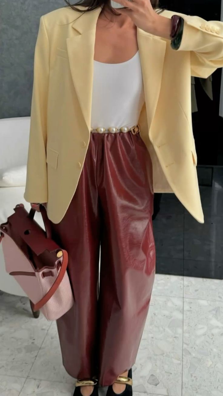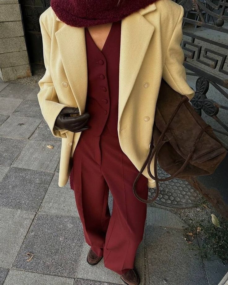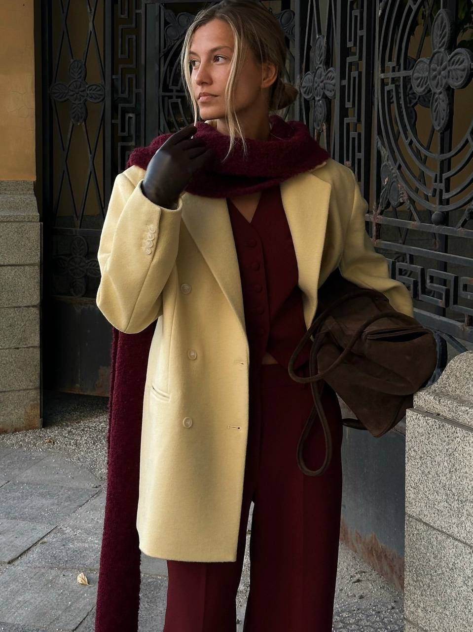 Esta dupla resulta porque é o ponto perfeito entre delicadeza e profundidade. O amarelo manteiga, muito suave e luminoso, ilumina o look sem ser óbvio, enquanto o bordô acrescenta peso, sofisticação e um toque quase aristocrático. É uma combinação que funciona tanto em looks de inverno como de meia-estação, especialmente quando aplicada em peças de alfaiataria ou malhas estruturadas.