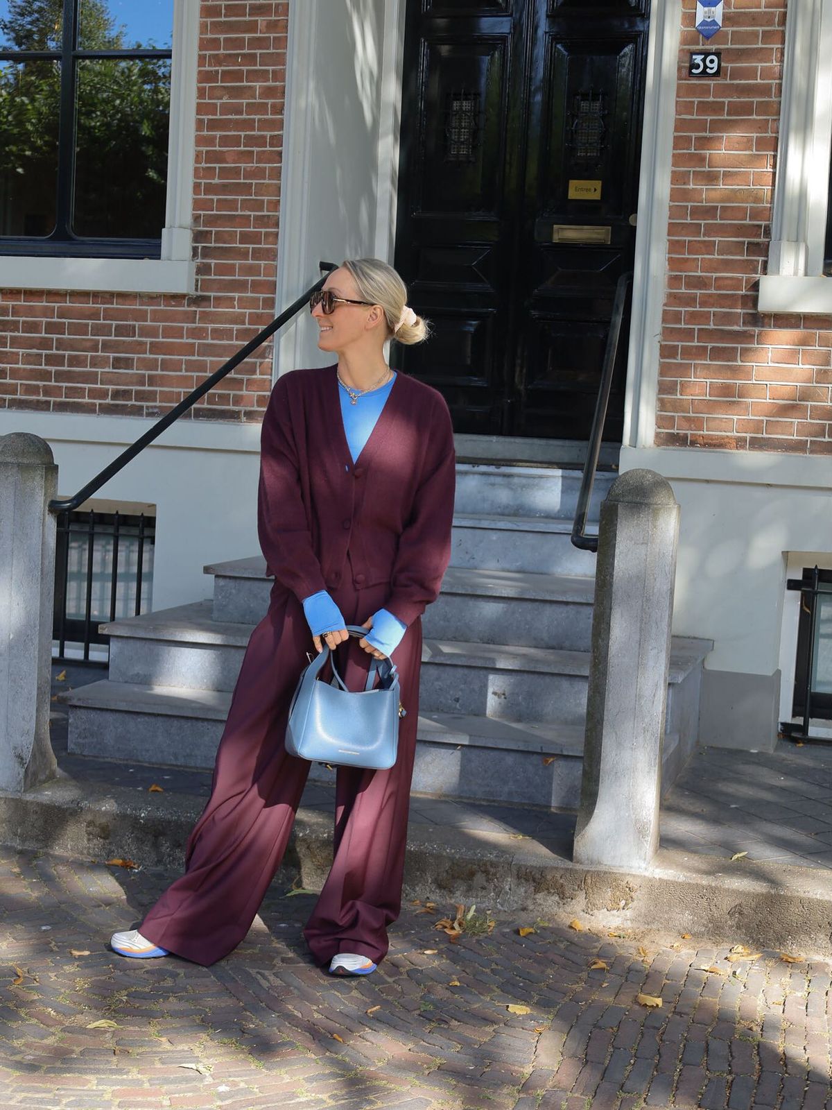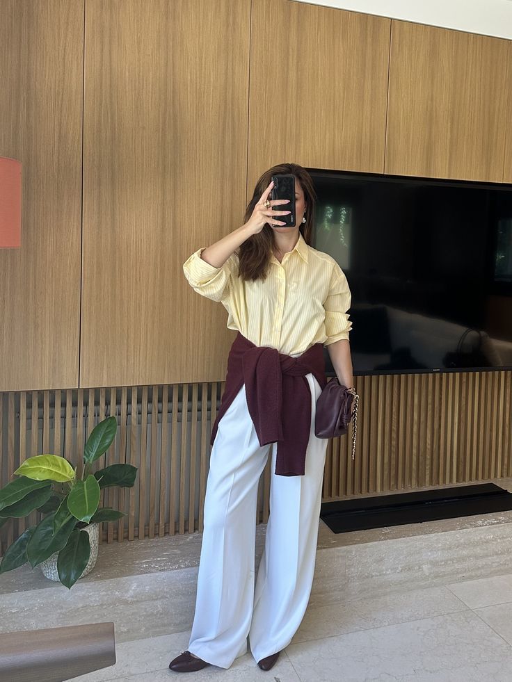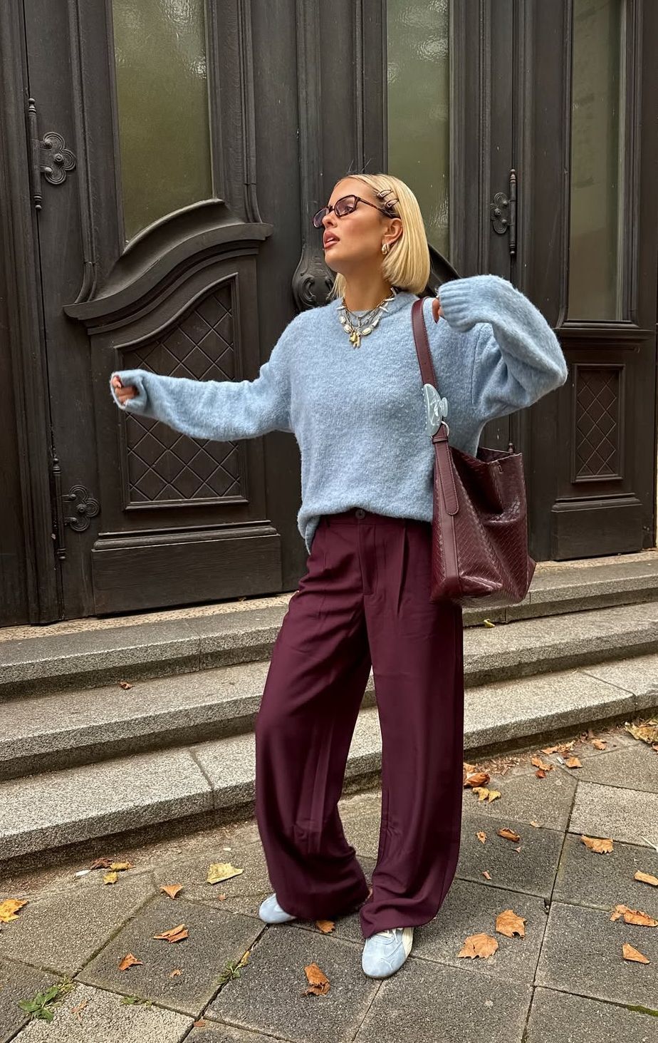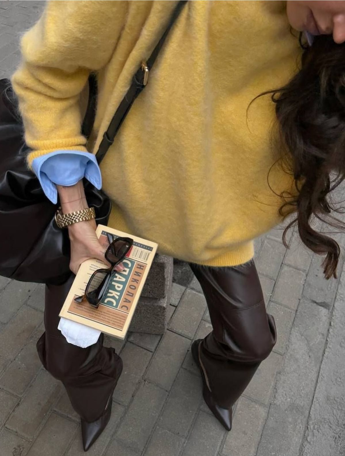 Esta dupla resulta porque é o ponto perfeito entre delicadeza e profundidade. O amarelo manteiga, muito suave e luminoso, ilumina o look sem ser óbvio, enquanto o bordô acrescenta peso, sofisticação e um toque quase aristocrático. É uma combinação que funciona tanto em looks de inverno como de meia-estação, especialmente quando aplicada em peças de alfaiataria ou malhas estruturadas.
