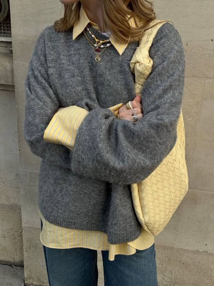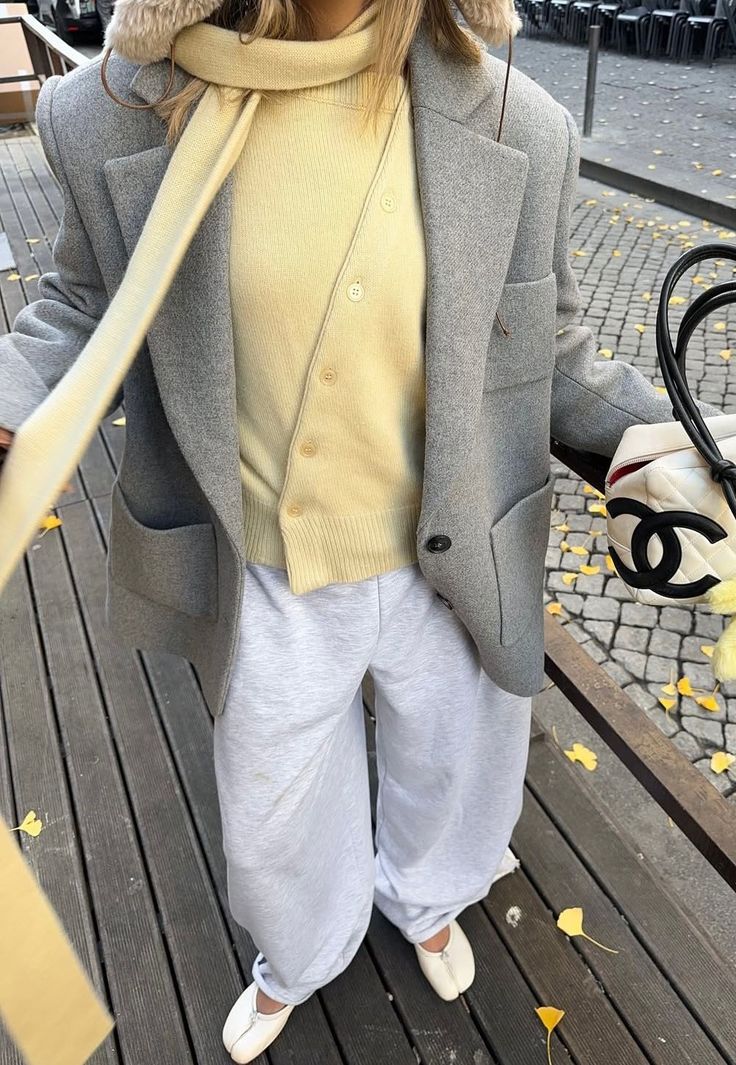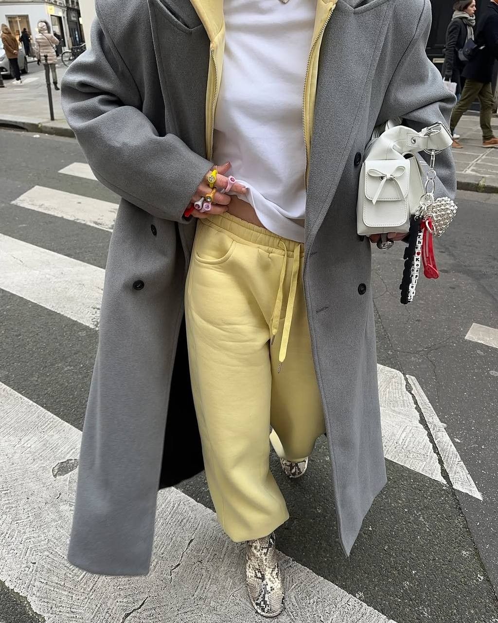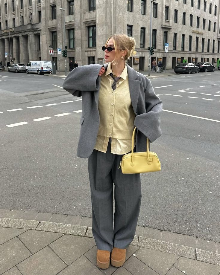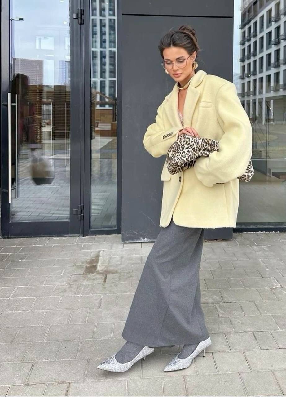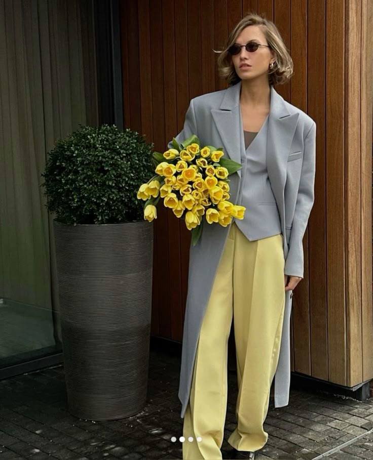 É uma combinação mais minimalista, mas com imensa graça. O cinzento funciona como base neutra, enquanto o amarelo manteiga acrescenta luz e frescura ao conjunto. É uma combinação perfeita para quem aprecia looks clean, modernos e fáceis de usar, mas que ainda assim conseguem fugir à monotonia do dia a dia.
