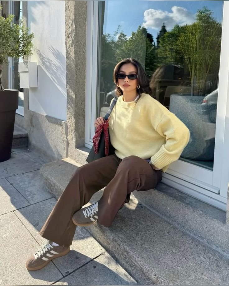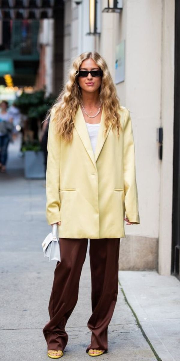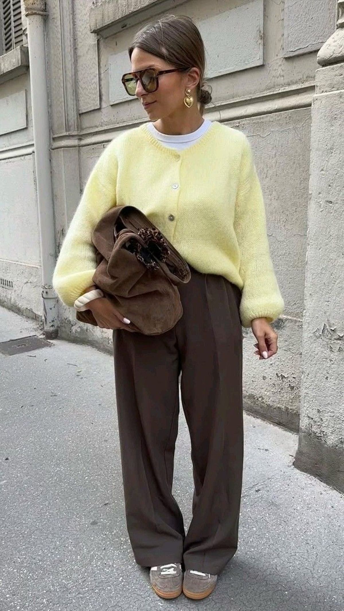 Aqui, o segredo está na sofisticação que não nos grita. O castanho, que é mais quente e terroso, ganha uma nova vida quando é combinado com um amarelo manteiga suave, que ilumina os looks sem roubar protagonismo. É uma paleta que transmite elegância e conforto, perfeita para quem gosta de looks intemporais, mas com um twist contemporâneo.