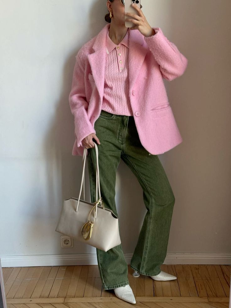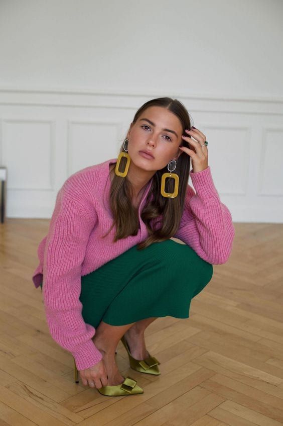 Esta combinação é clássica, mas está longe de ser aborrecida. O rosa traz leveza e um lado mais romântico aos looks, ao passo que o verde, seja ele mais vibrante ou mais fechado, introduz frescura e mais sobriedade. Juntos, criam um contraste visual interessante que foge ao previsível e resulta particularmente bem em looks descontraídos.
