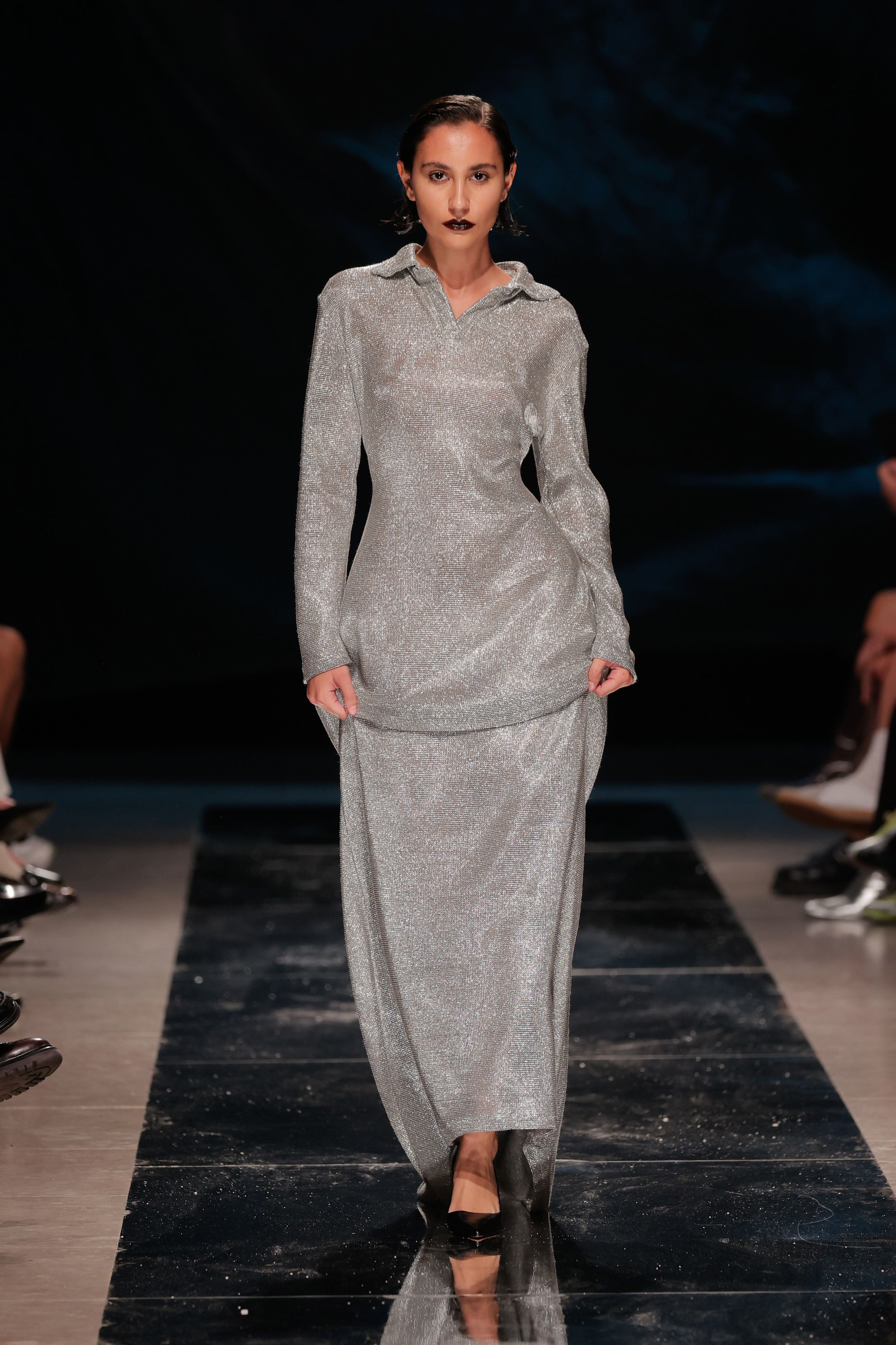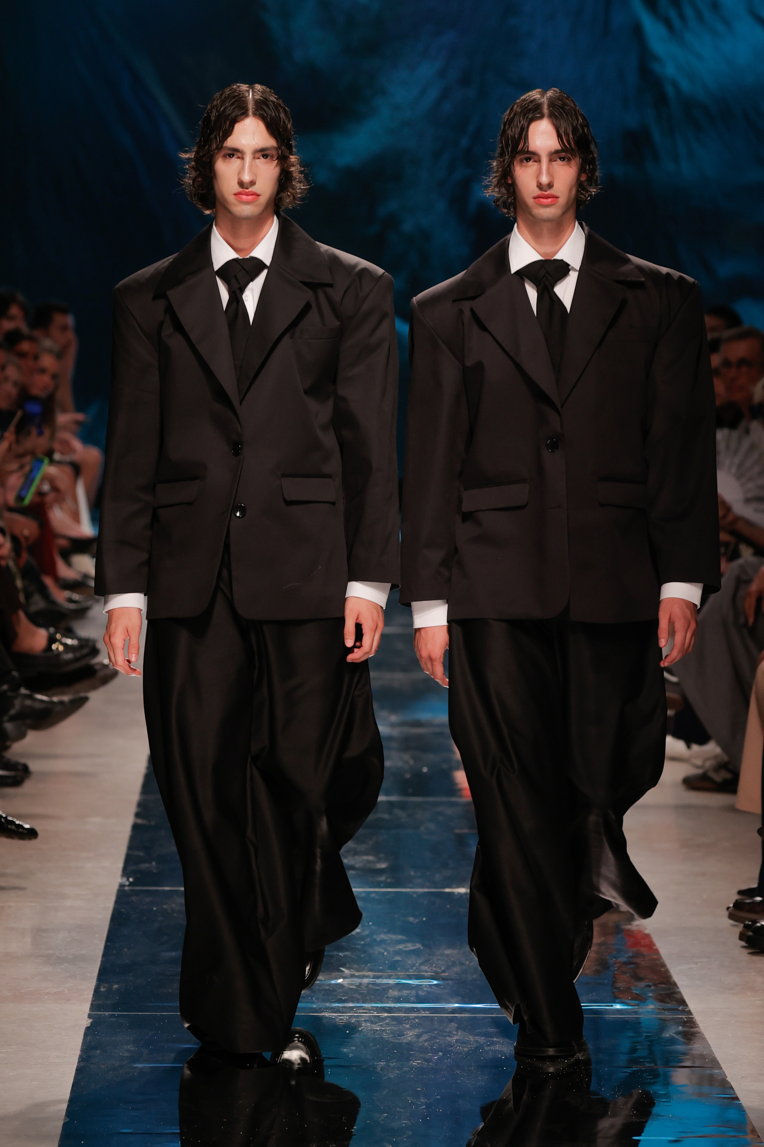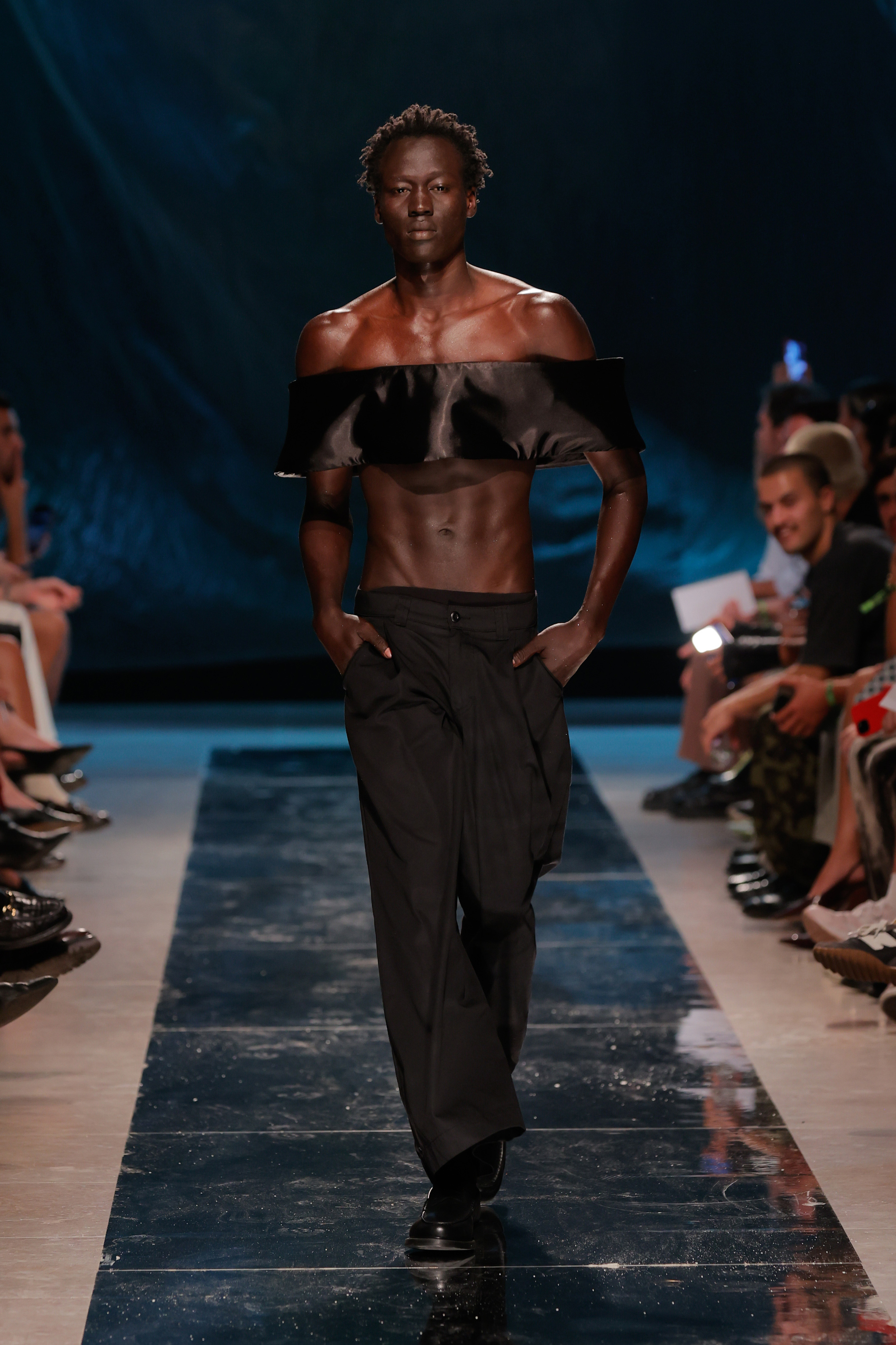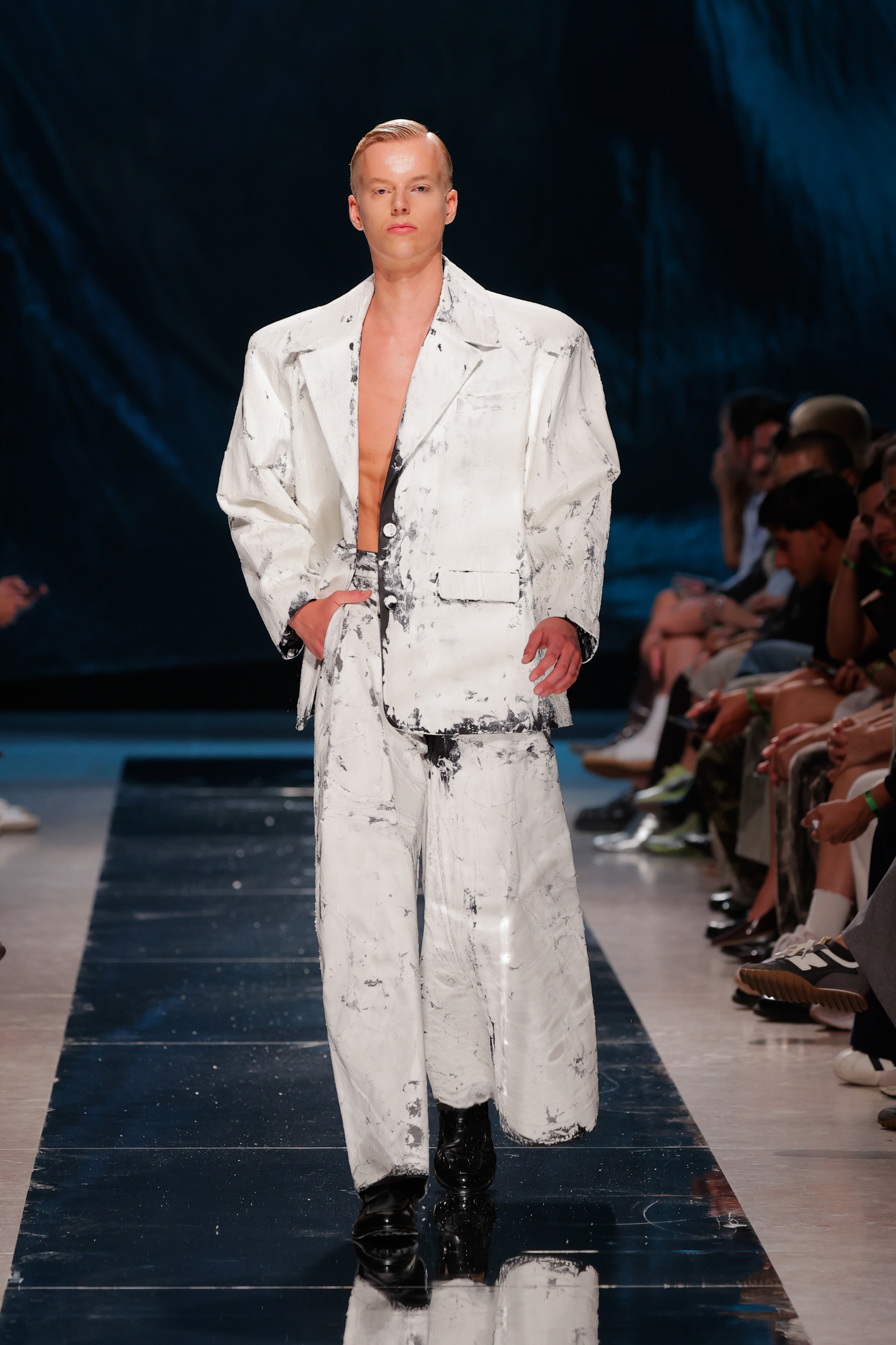 Se foi tudo tão fluído como o conceito queria transmitir? Não. A sala do Pátio da Galé recebeu um chão espelhado que ninguém podia pisar para que não ficasse sujo antes da apresentação das peças, o que obrigou a sucessivas limpezas antes do começo do desfile. Junte-se a isso uma hora de atraso e tivemos o mais português dos paradoxos: uma ode à liberdade criativa que começou presa por protocolos e um frenesim de mopas a percorrer o espaço.
