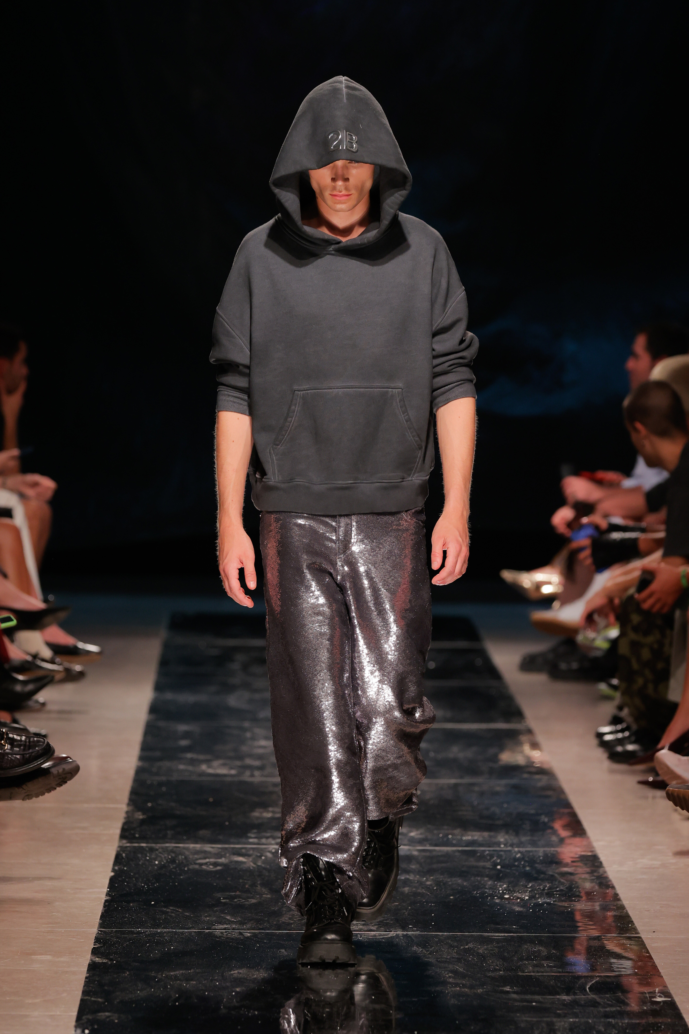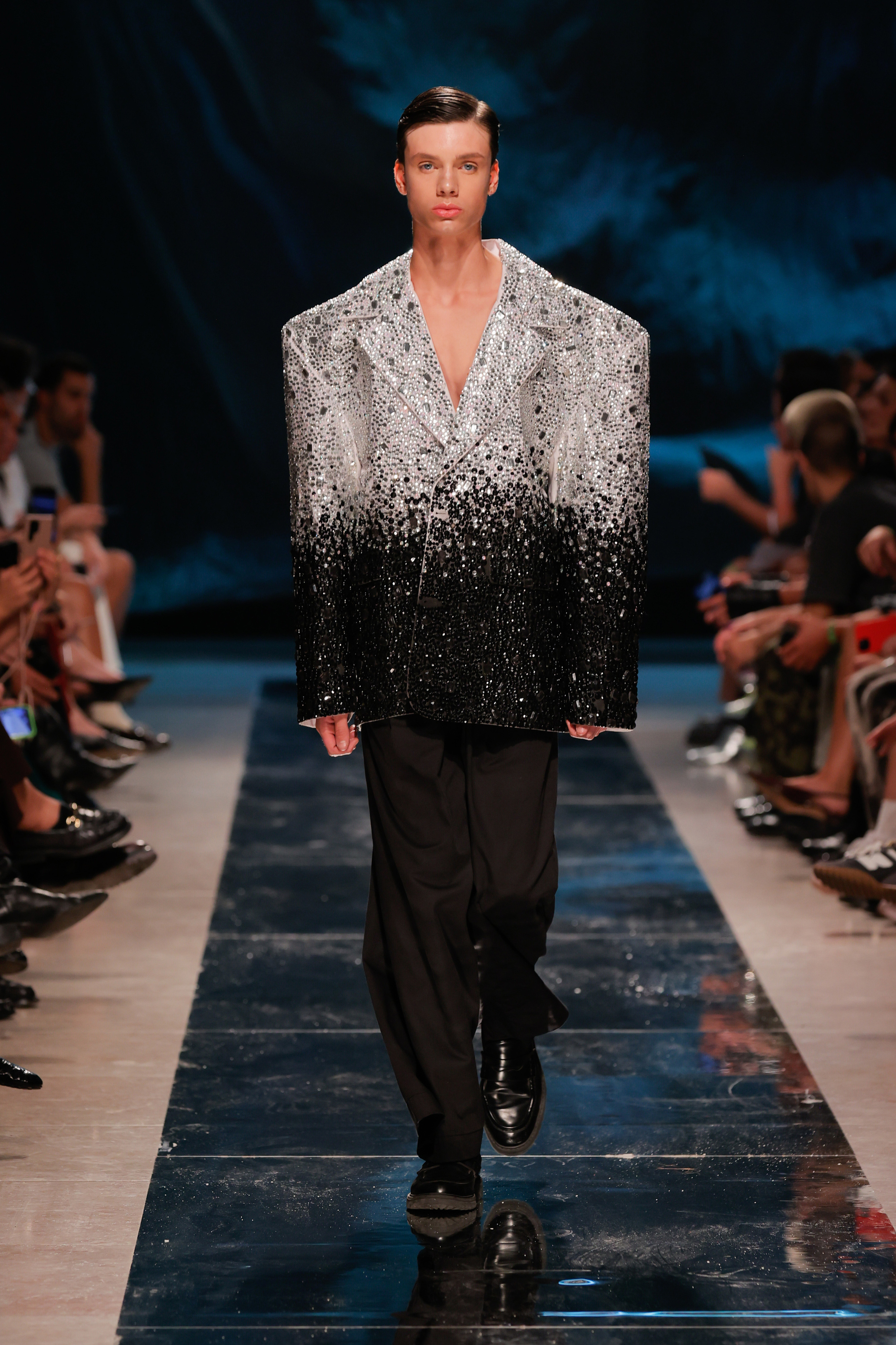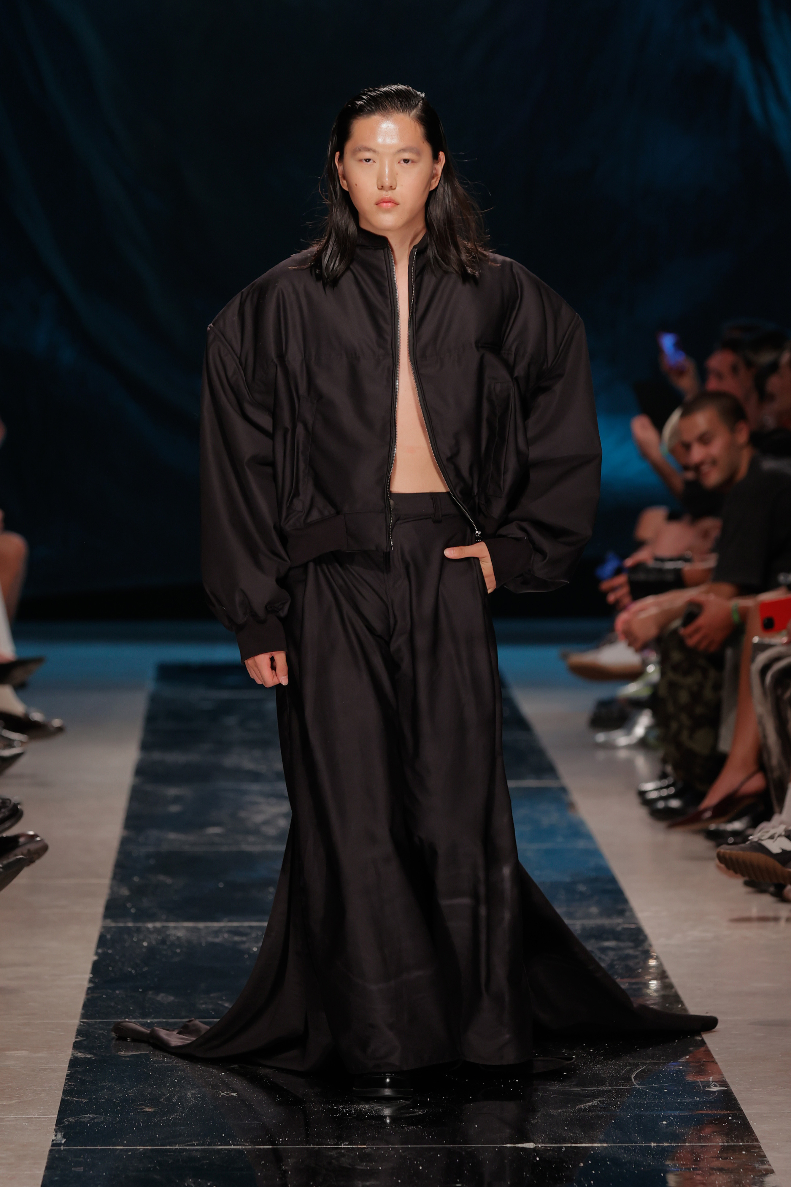 Se foi tudo tão fluído como o conceito queria transmitir? Não. A sala do Pátio da Galé recebeu um chão espelhado que ninguém podia pisar para que não ficasse sujo antes da apresentação das peças, o que obrigou a sucessivas limpezas antes do começo do desfile. Junte-se a isso uma hora de atraso e tivemos o mais português dos paradoxos: uma ode à liberdade criativa que começou presa por protocolos e um frenesim de mopas a percorrer o espaço.