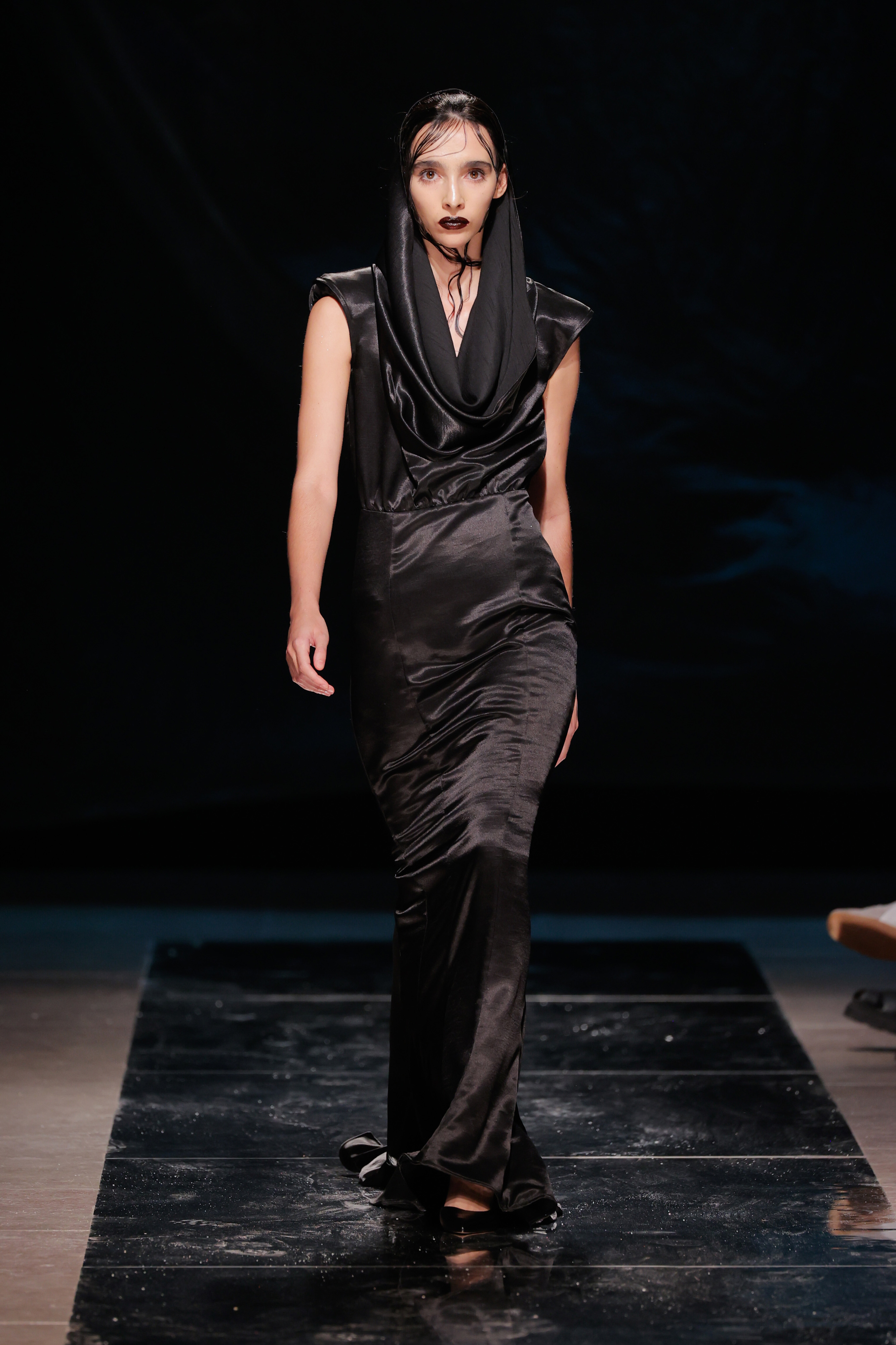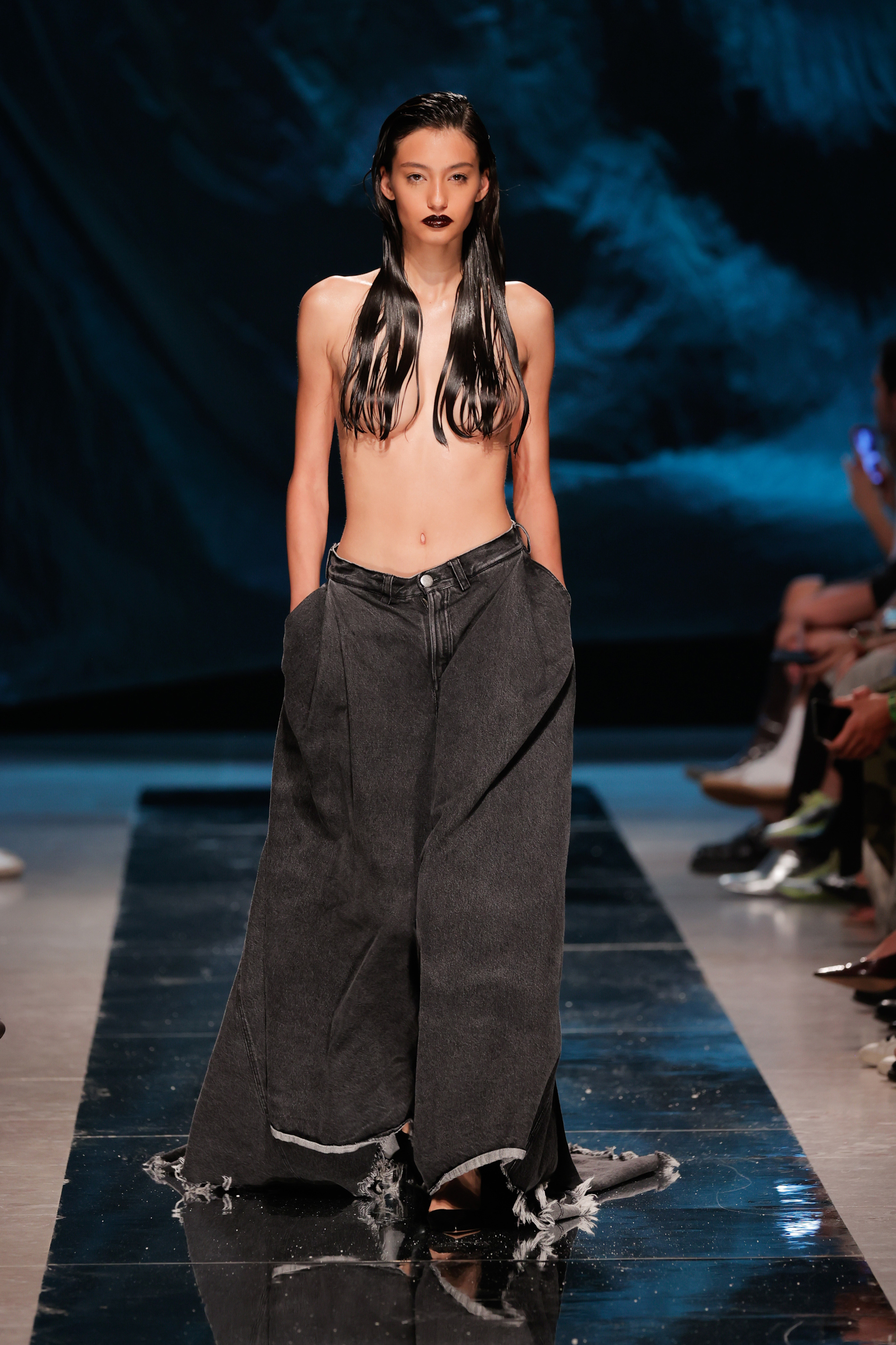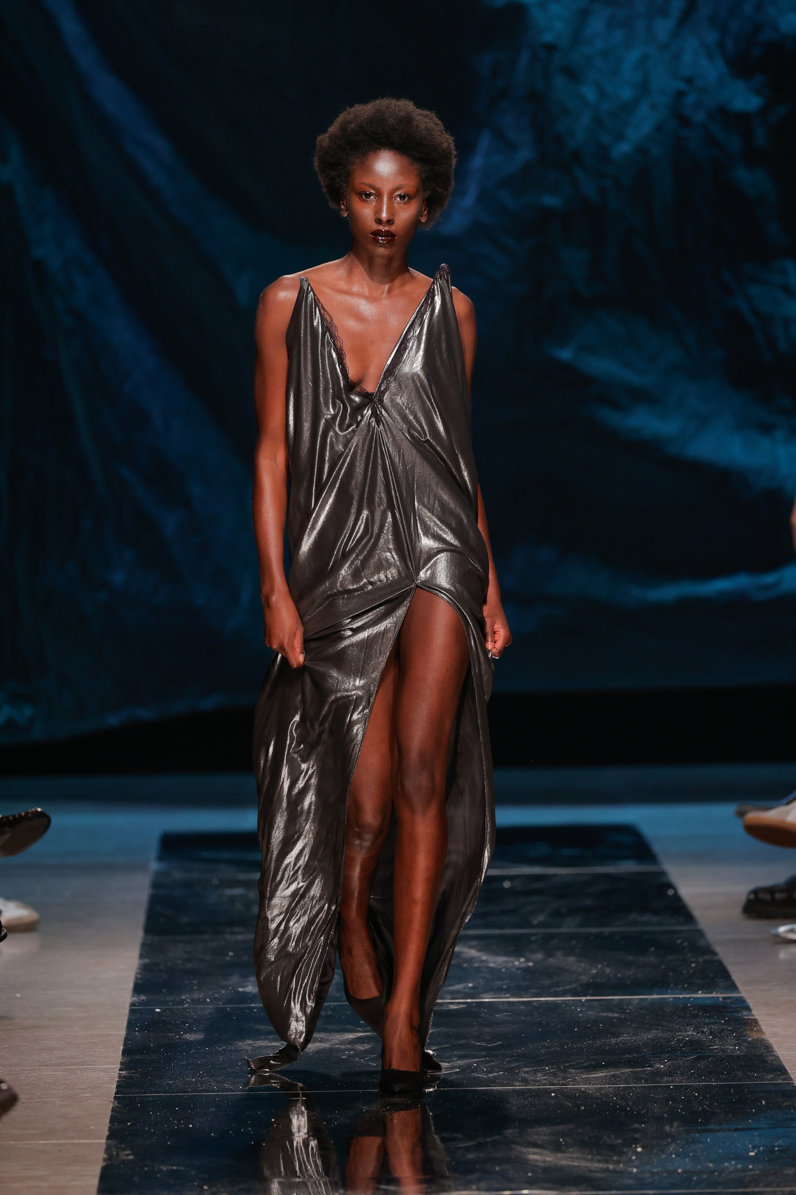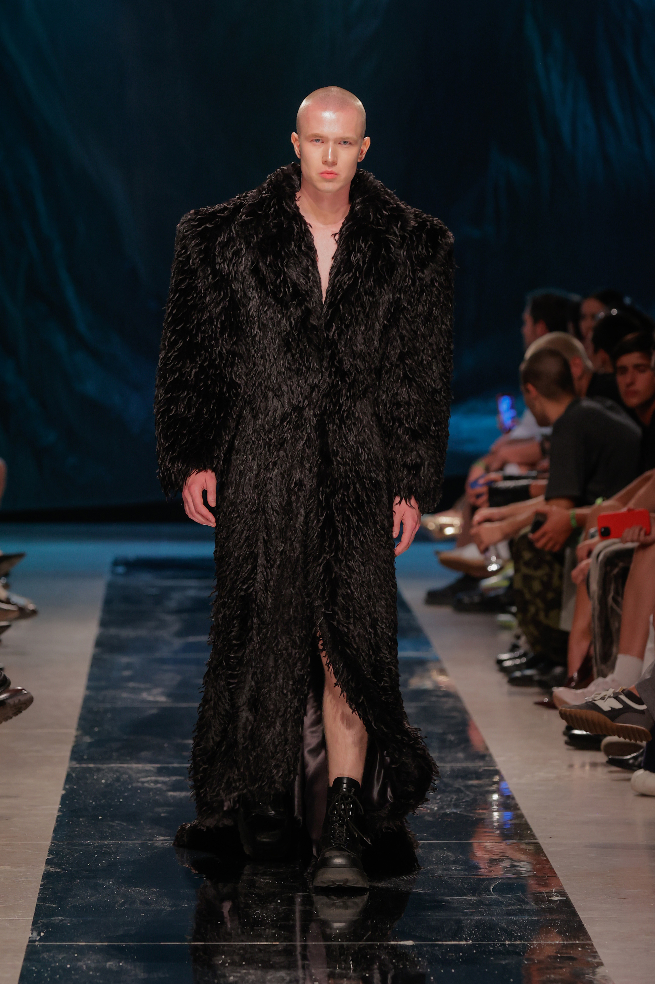 Se foi tudo tão fluído como o conceito queria transmitir? Não. A sala do Pátio da Galé recebeu um chão espelhado que ninguém podia pisar para que não ficasse sujo antes da apresentação das peças, o que obrigou a sucessivas limpezas antes do começo do desfile. Junte-se a isso uma hora de atraso e tivemos o mais português dos paradoxos: uma ode à liberdade criativa que começou presa por protocolos e um frenesim de mopas a percorrer o espaço.