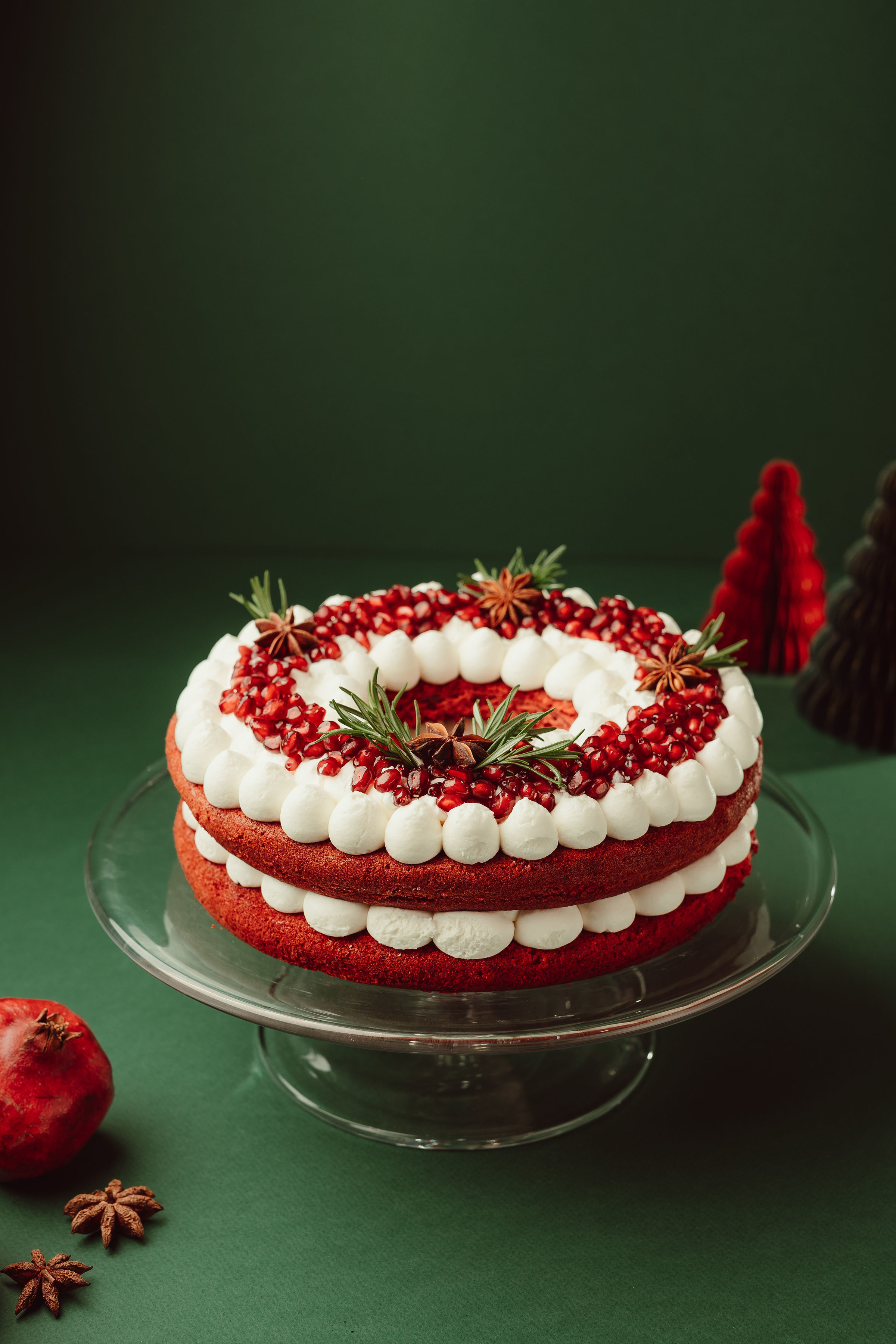 A coroa red velvet, presente no leque de especiais desde o início, chega com um novo sabor este ano: uma base leve, coberta com cream cheese de mascarpone, finalizada com romã, alecrim e flor de anis (49,90€).