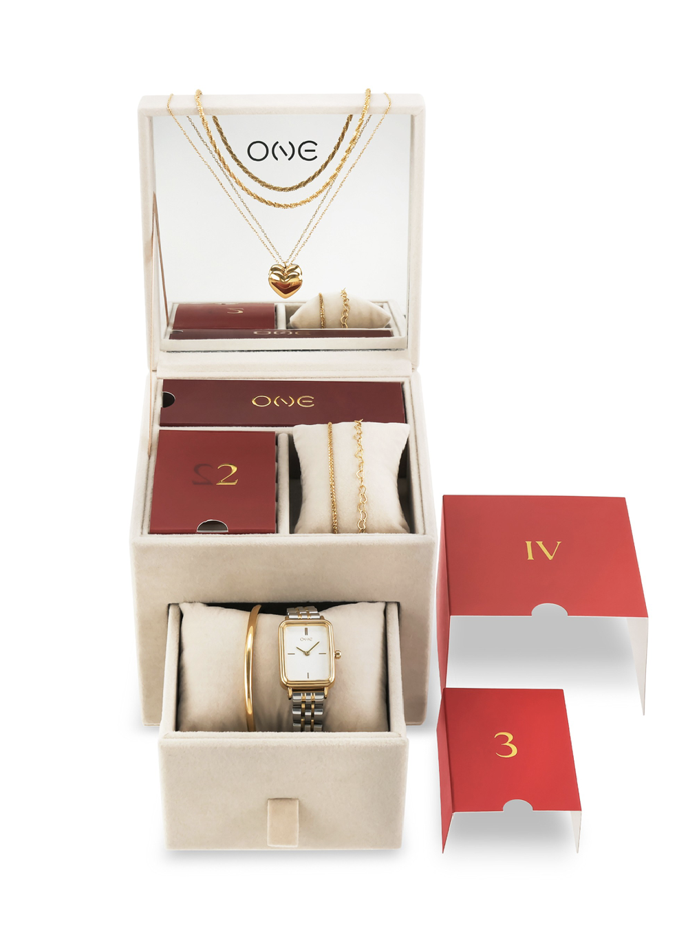 No interior do Calendário do Advento One White encontram-se peças como o relógio analógico bicolor, a protagonista do mesmo. Entre as surpresas, destaca-se também a pulseira escrava Dazzle, um par de brincos com centro em madrepérola, duas pulseiras douradas, uma delas com elos em formato de coração entrelaçados, e dois colares exclusivos, um com pendente de coração dourado e outro com uma malha densa.