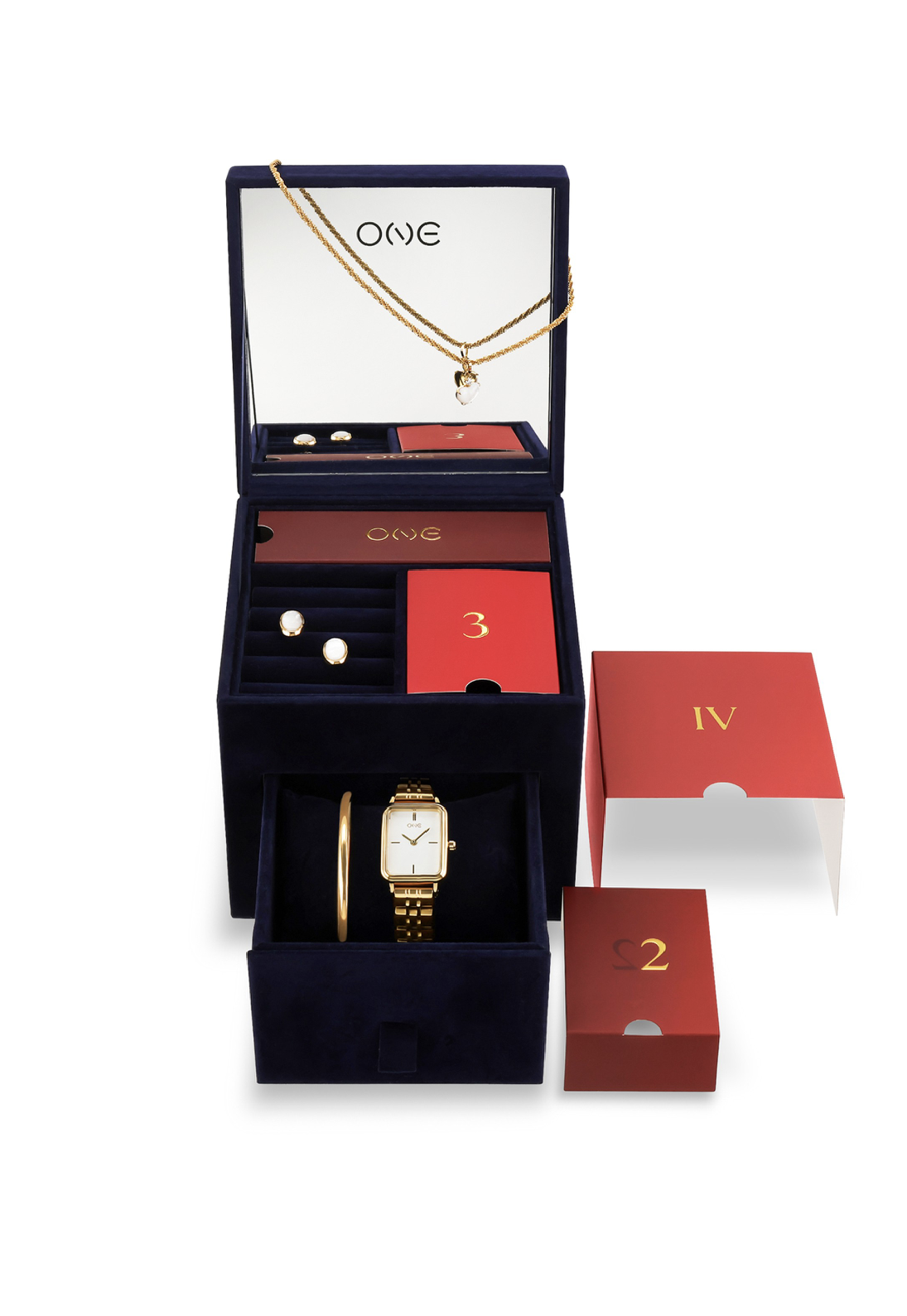 Por sua vez, no Calendário do Advento One Blue o grande destaque é o relógio analógico dourado com mostrador branco. A acompanhar, a bestseller da marca Dazzle, duas pulseiras douradas delicadas, um par de brincos com madrepérola e dois colares, um deles com um pendente em forma de coração adornado com um cristal zircónia branco, compatível com outros charms ONE.