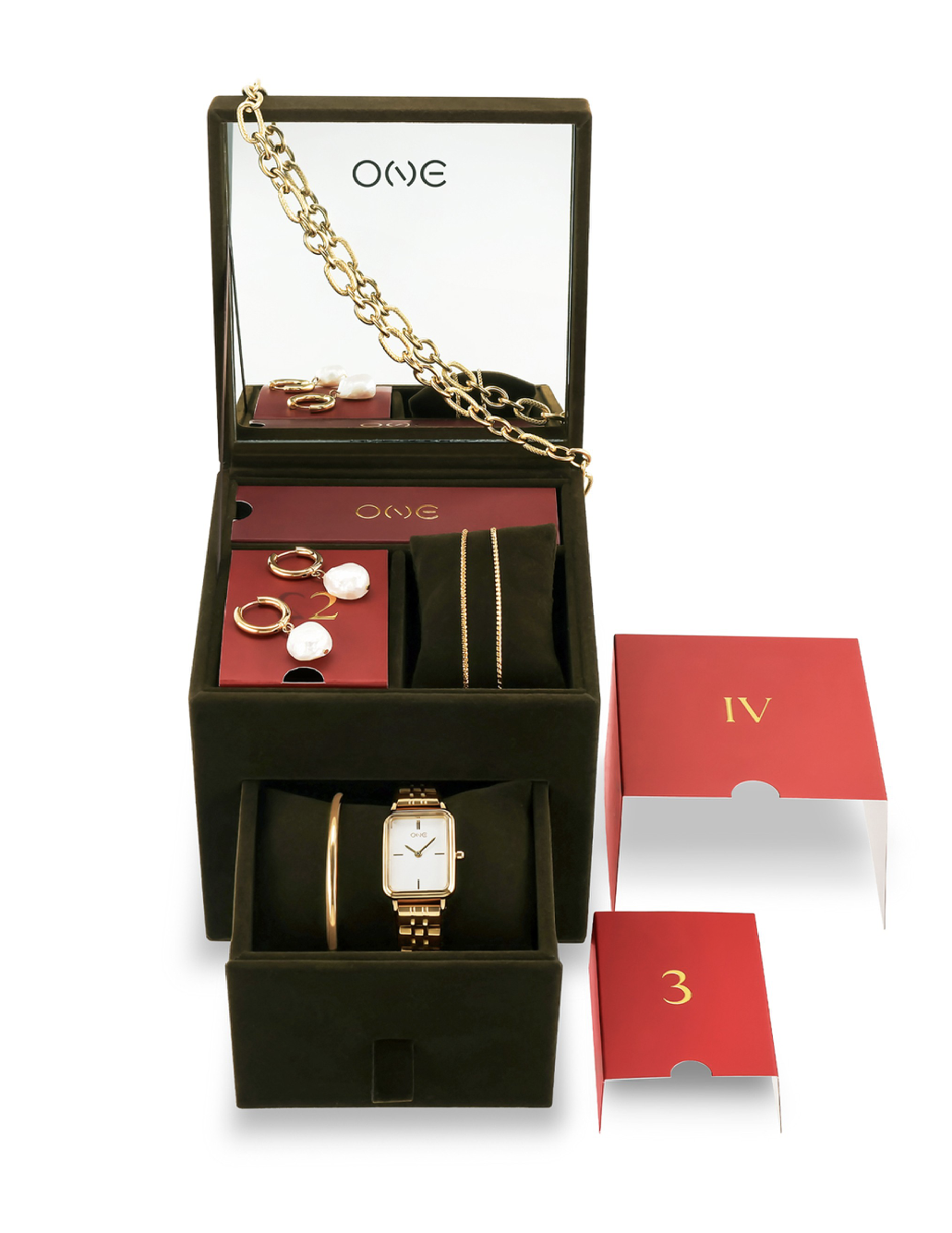 Já o Calendário do Advento One Dry Green, à semelhança das duas edições anteriores, conta com relógio analógico dourado, igual ao do Calendário do Advento One Blue, assim como a pulseira Dazzle, duas pulseiras douradas finas, os sofisticados brincos Pearly Hoops e o colar mais arrojado das três edições.