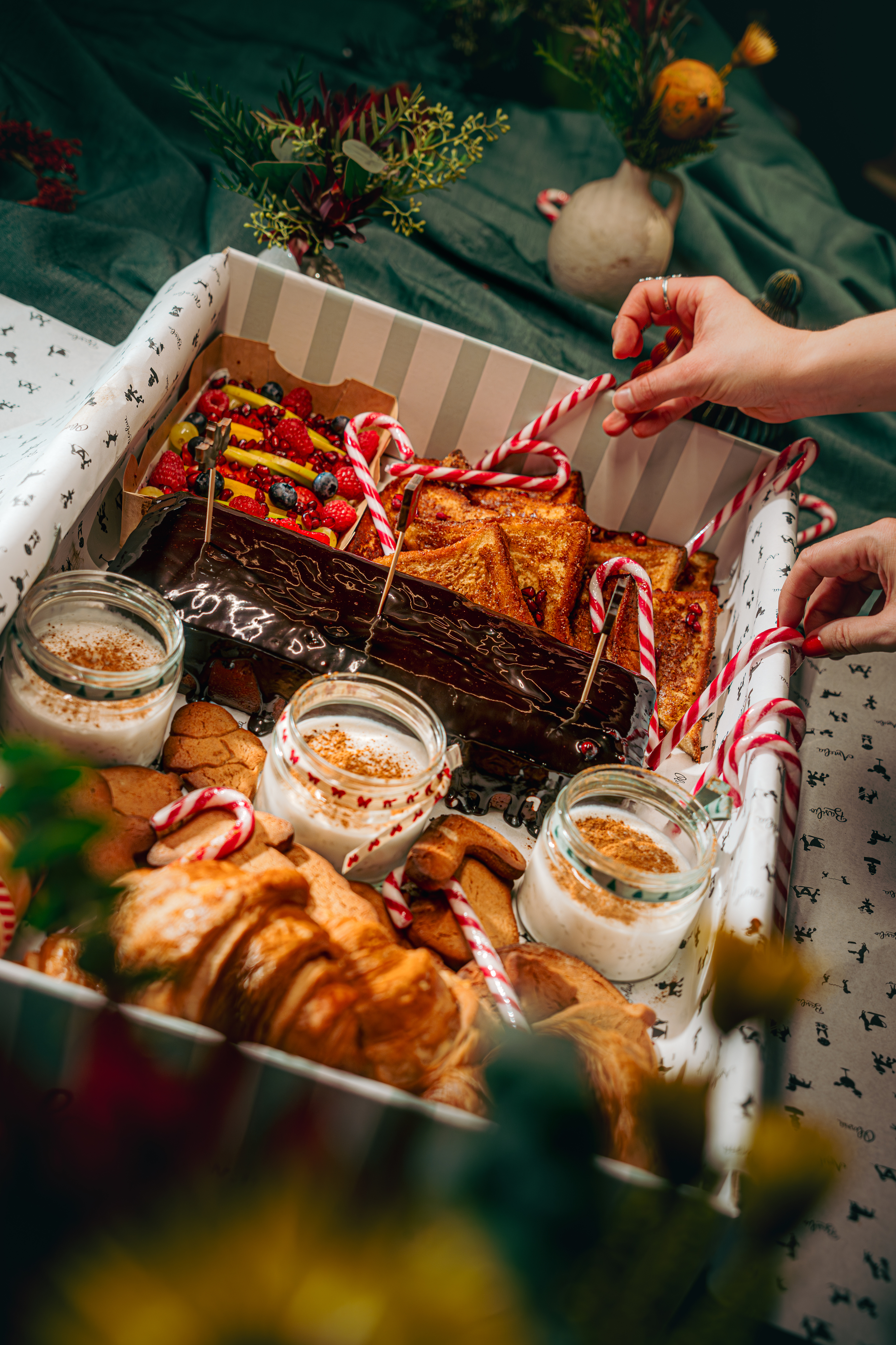 A X-mas Box surge em estilo cabaz de Natal, pronta para partilhar ou oferecer, por 148€. Vem recheada com uma seleção de clássicos e dos doces característicos desta época, como rabanadas, bolo de cenoura com chocolate, croissants, compotas de Natal, frutas, arroz-doce vegan, bengalas de açúcar de Natal e bolachas de gengibre.