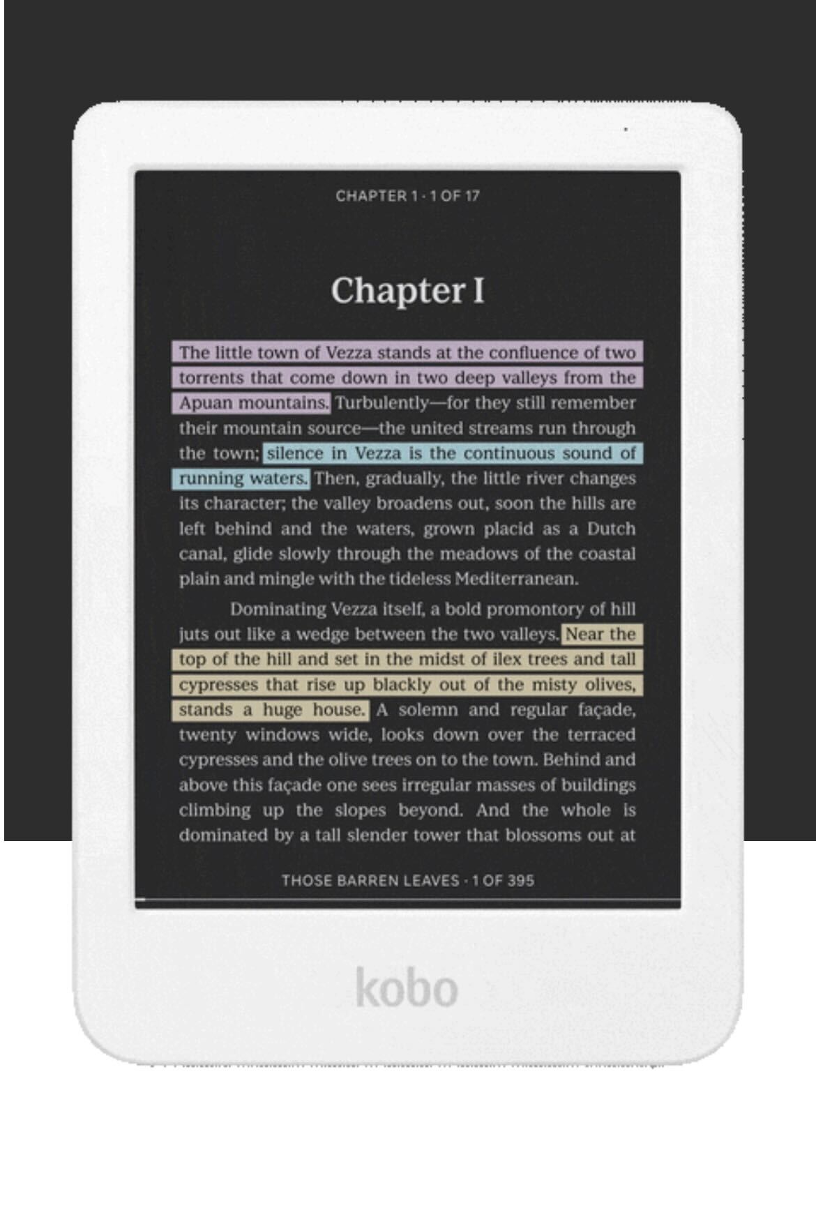 Para nós, isso foi essencial. Ao aumentar ligeiramente o espaçamento e as margens, deixámos de sentir aquele efeito “claustrofóbico” que por vezes surge em ecrãs mais pequenos. O resultado? Uma leitura muito mais leve, que ficou ainda melhor quando descobrimos a outra vantagem do Kobo Clara Colour - os sublinhados. Para quem tem a mania de sublinhar tudo menos livros (sentimos sempre que os estamos a estragar, mas parabéns a quem o faz), esta foi a oportunidade perfeita para o começar a fazer sem culpas.