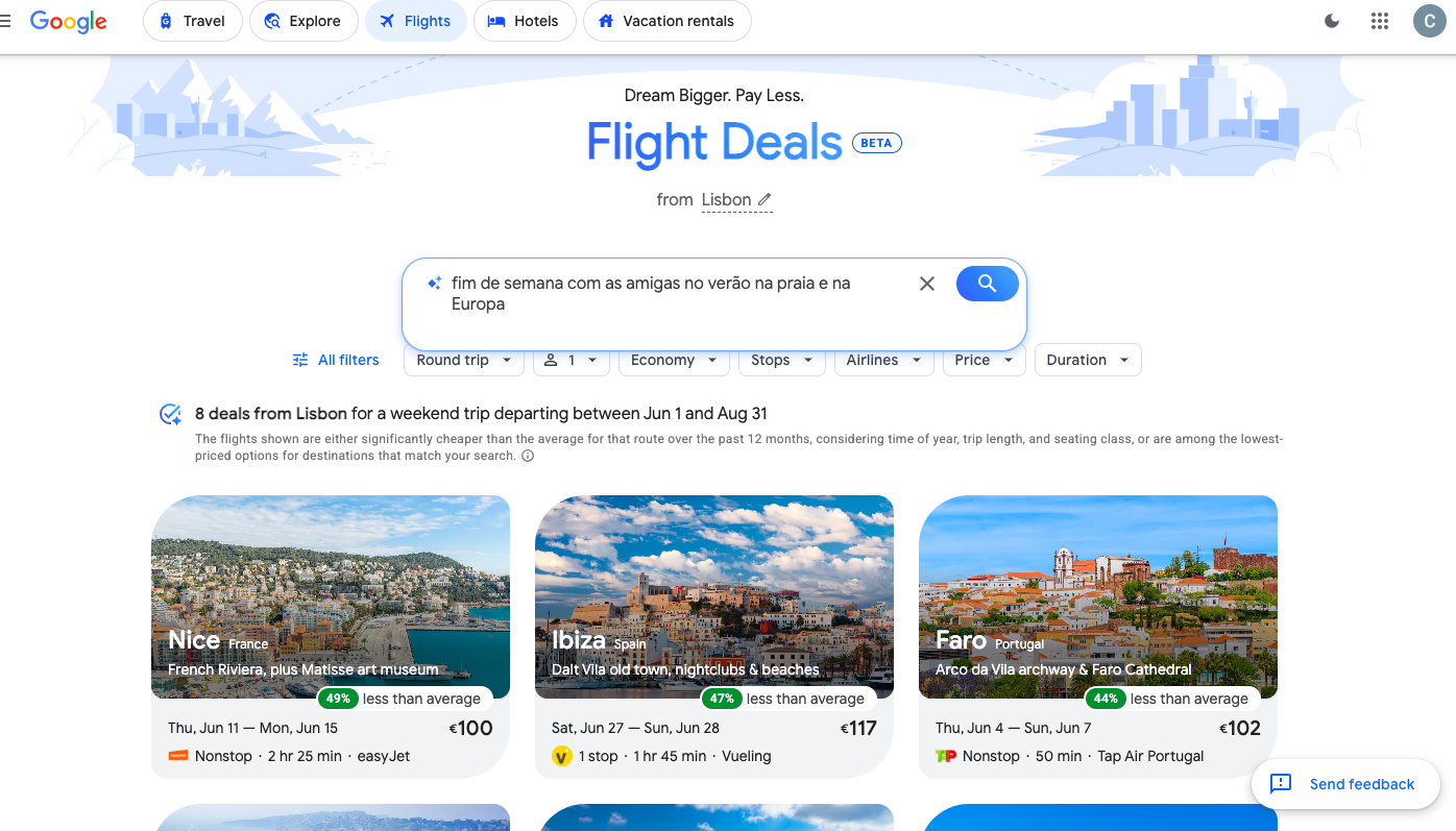 Esta ferramenta recorre à compreensão de linguagem natural para interpretar outros desejos vagos como “escapadinha para a praia”, “ver o melhor pôr do sol do Mundo” ou "fim de semana com amigas". Em vez de o obrigar a escolher aeroportos e datas específicas, a IA analisa a intenção do pedido e sugere destinos, períodos ideais e voos com preços abaixo do habitual.