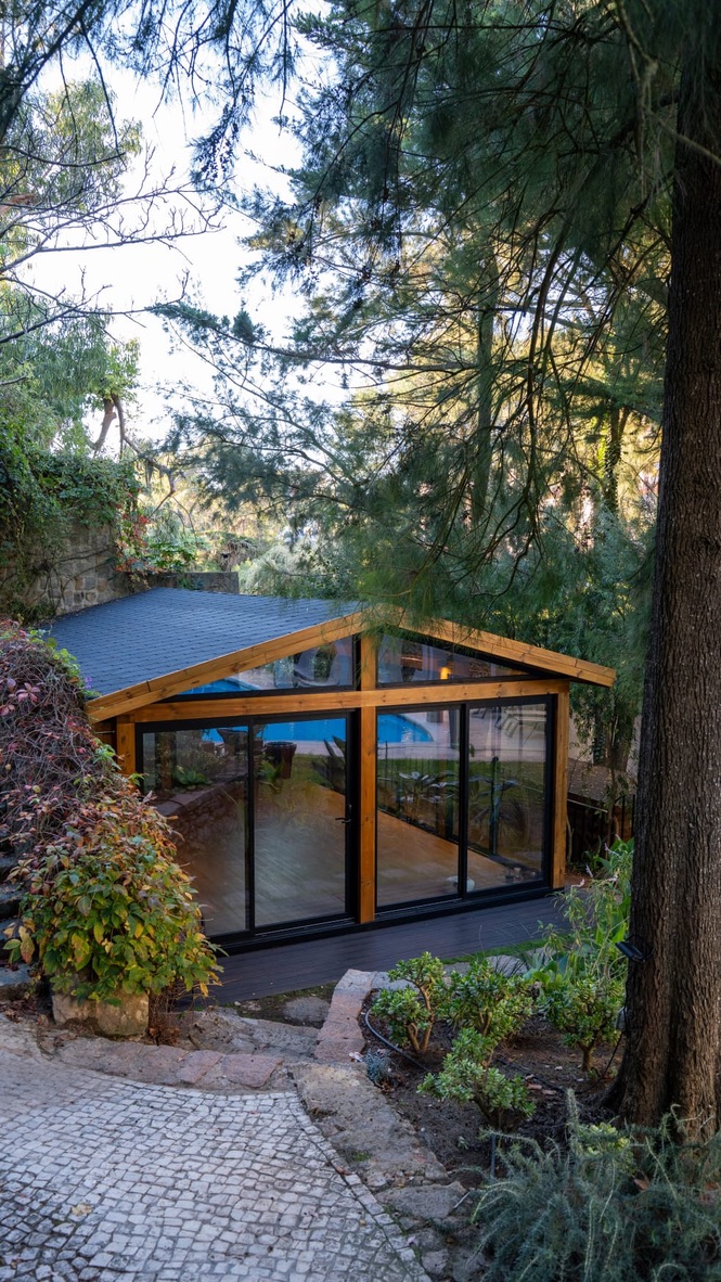 Com foco no bem-estar e na longevidade, a sala com vista 360 graus permite praticar ioga, mantendo contacto visual permanente com a natureza verde, luz natural, silêncio e a sensação de estar a praticar ao ar livre, sempre resguardados da chuva e do frio.